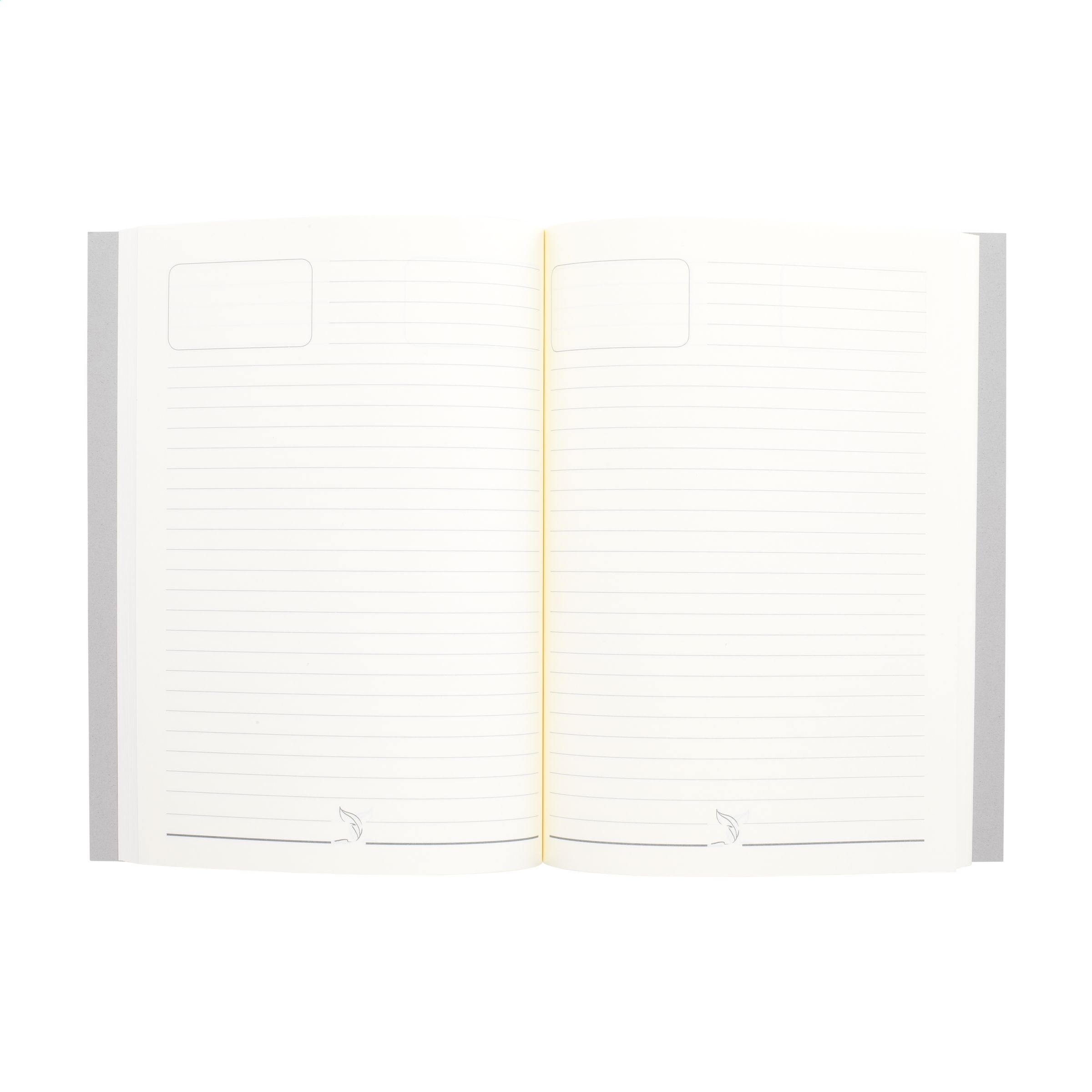 WoW! Notizbuch im A5-Format. Mit 100 Blatt/200 Seiten liniertem Papier (80 g / m²). Der Softcover-Einband besteht zu 15% aus landwirtschaftlichen und organischen Abfällen, z. B. von Tomaten, Paprika, Pflanzen und Zwiebeln. Diese Abfälle werden mit Recyclingpapier aus Europa gemischt. Ein praktisches Notizbuch, um Ideen zu notieren und festzuhalten.