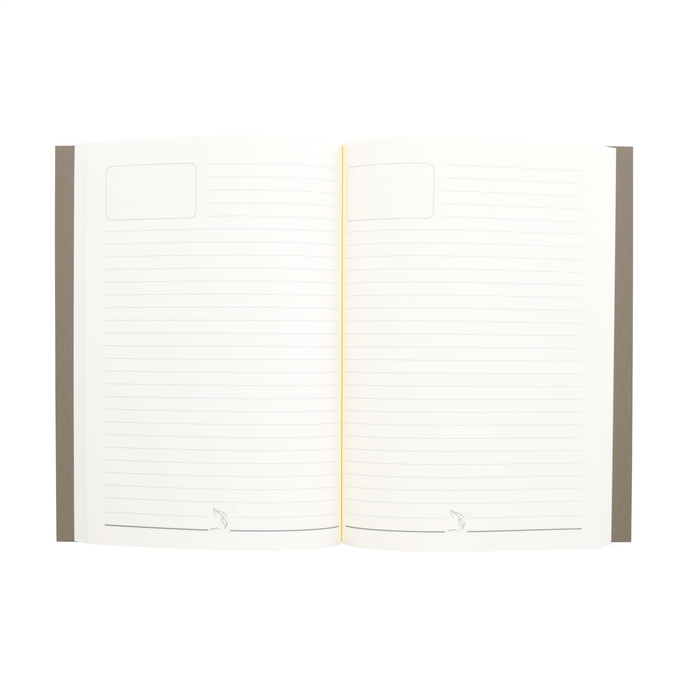 WoW! Notizbuch im A5-Format. Mit 100 Blatt/200 Seiten liniertem Papier (80 g / m²). Der Softcover-Einband besteht zu 15% aus landwirtschaftlichen und organischen Abfällen, z. B. von Tomaten, Paprika, Pflanzen und Zwiebeln. Diese Abfälle werden mit Recyclingpapier aus Europa gemischt. Ein praktisches Notizbuch, um Ideen zu notieren und festzuhalten.