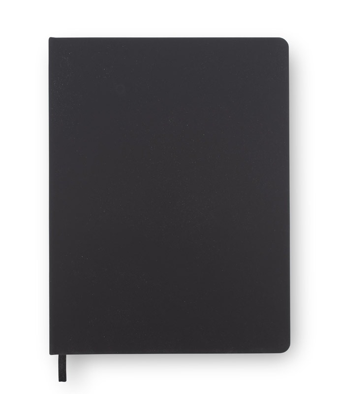 Geschmackvolles VITAL B5 Notizbuch mit farbigem Gummiband aus lederähnlichem Material (PU). Das Notizbuch enthält 80 ecrufarbene Blätter mit orangefarbenen Linien.