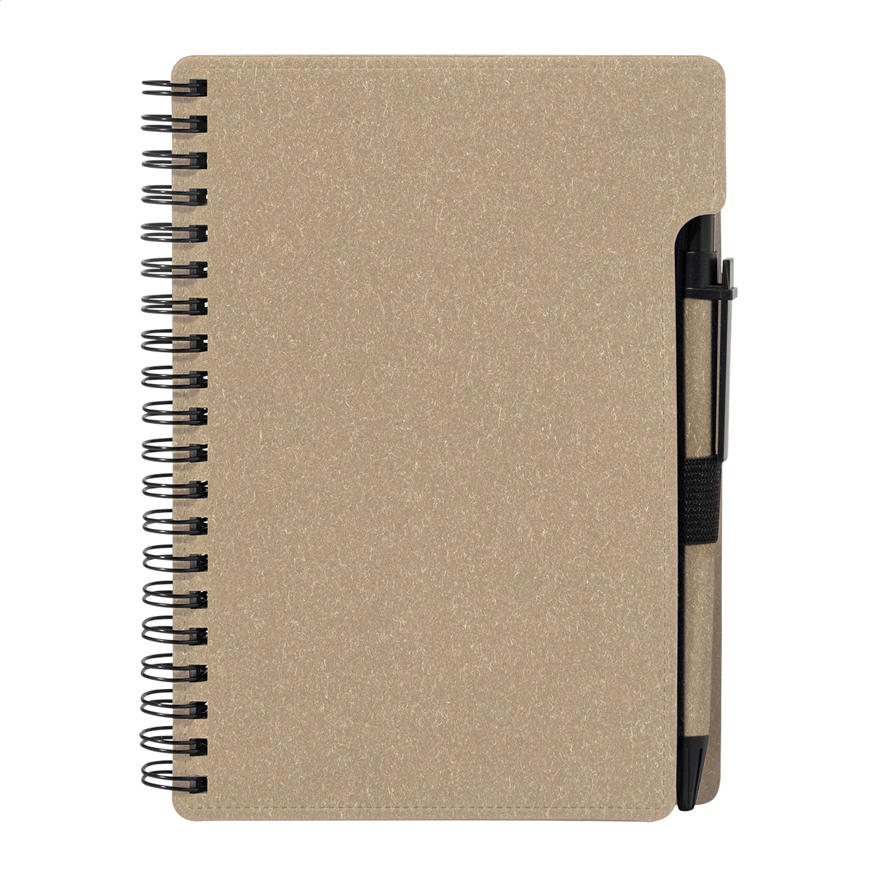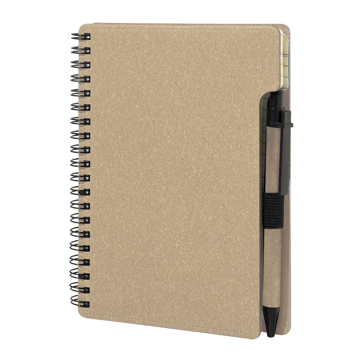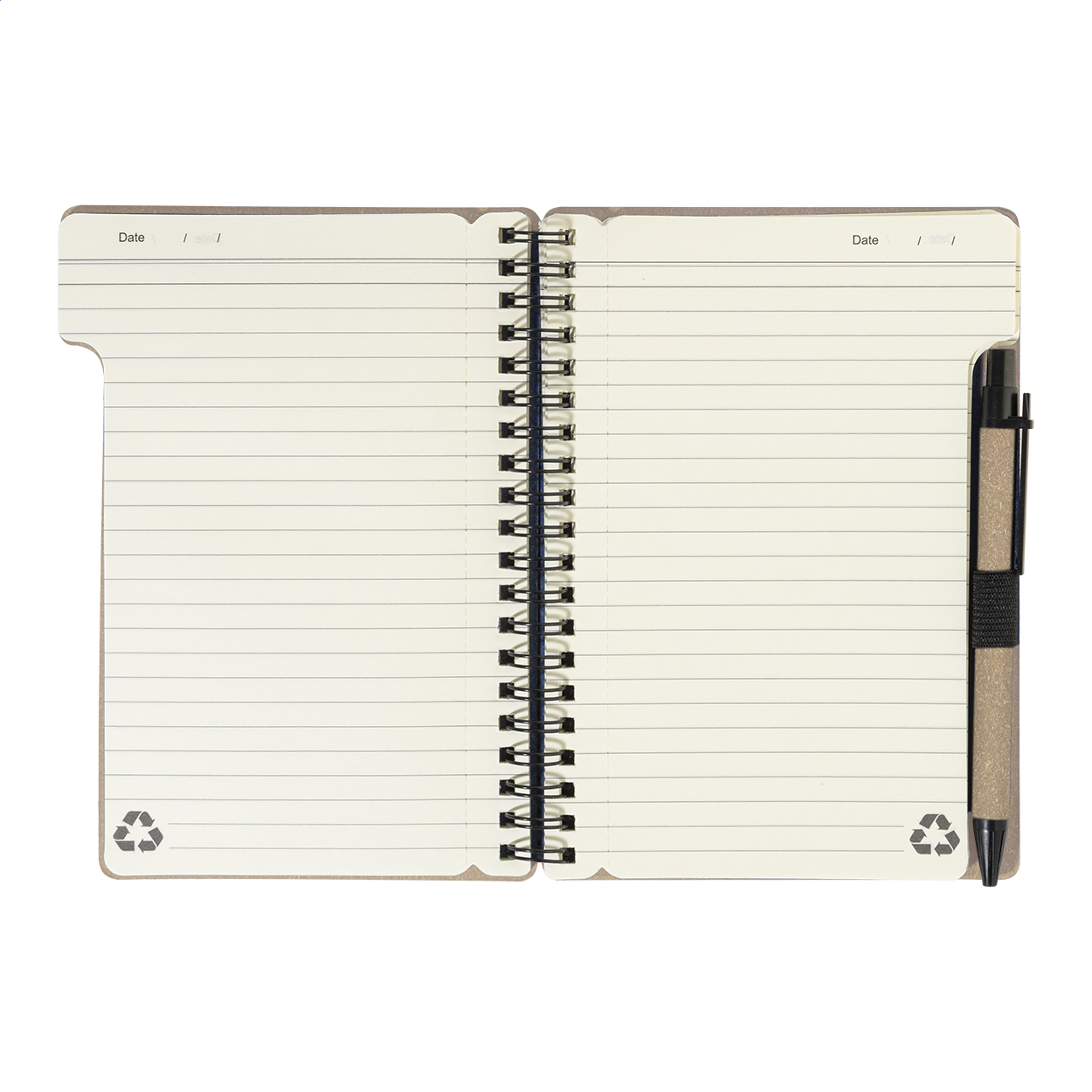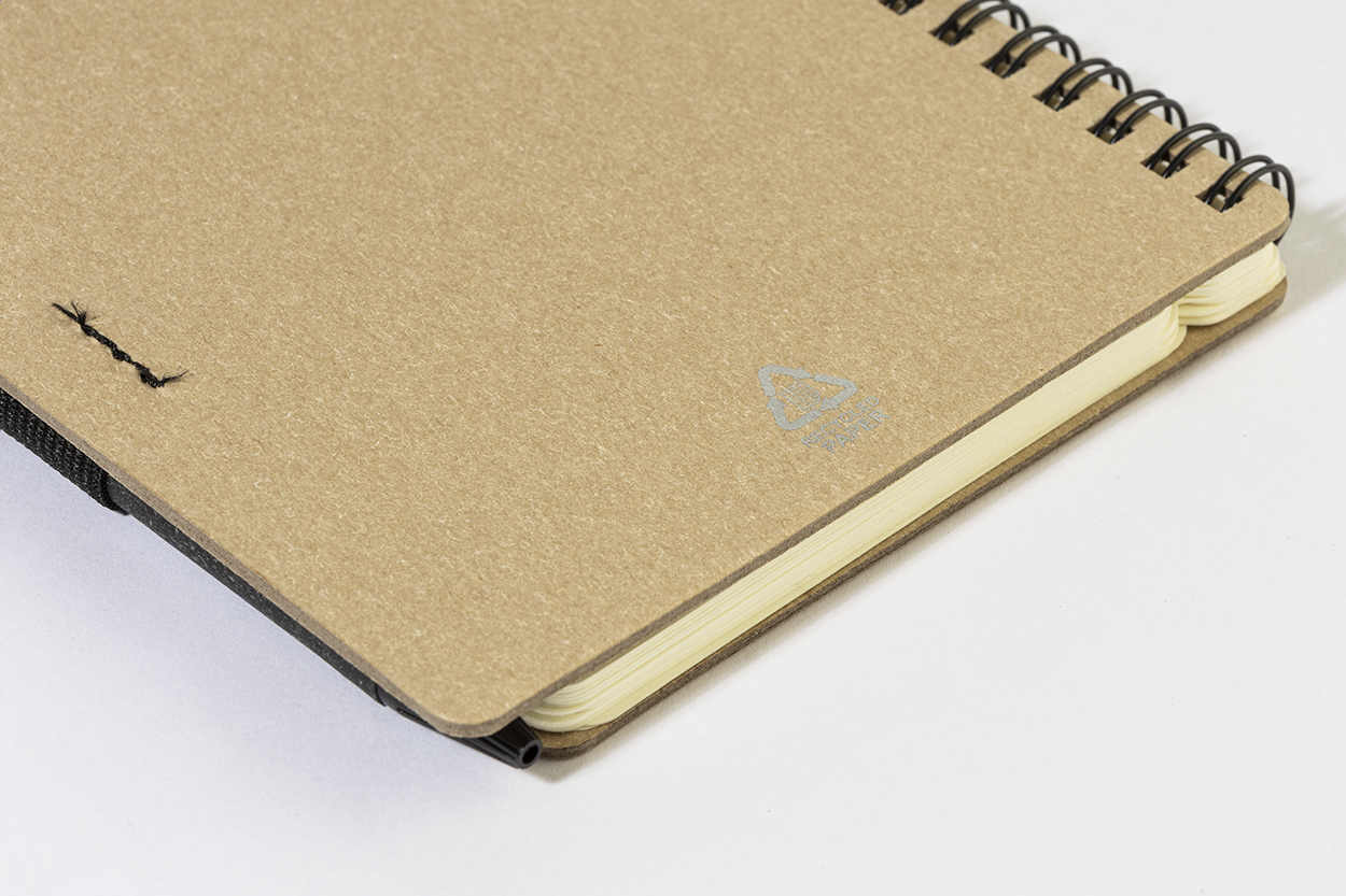 Spiralnotizbuch aus Recyclingpapier mit 80 Blättern (liniert). Format A6. Inklusive Recyclingpapier und Kugelschreiber aus Recycling-PP, blauschreibend.