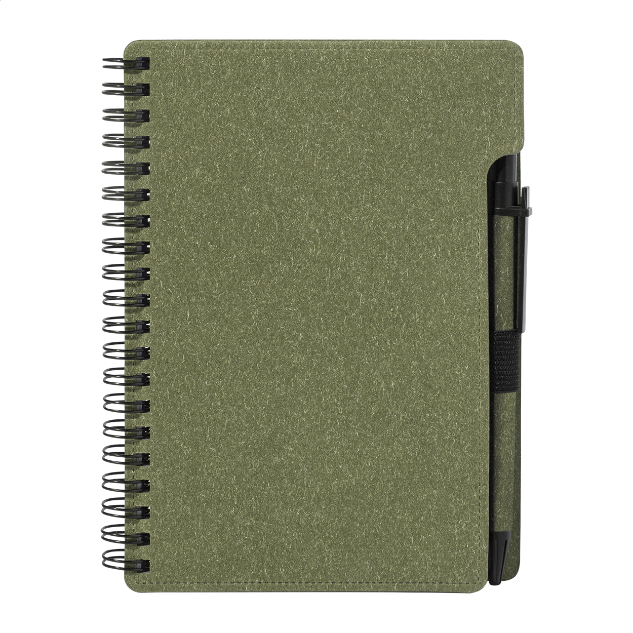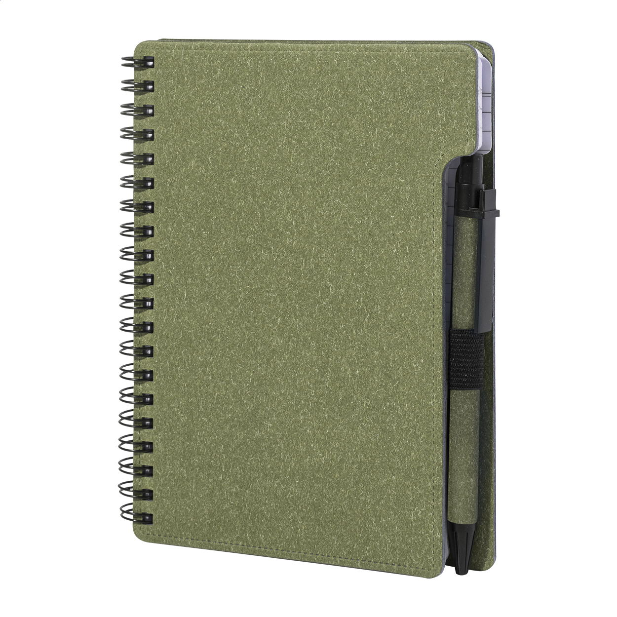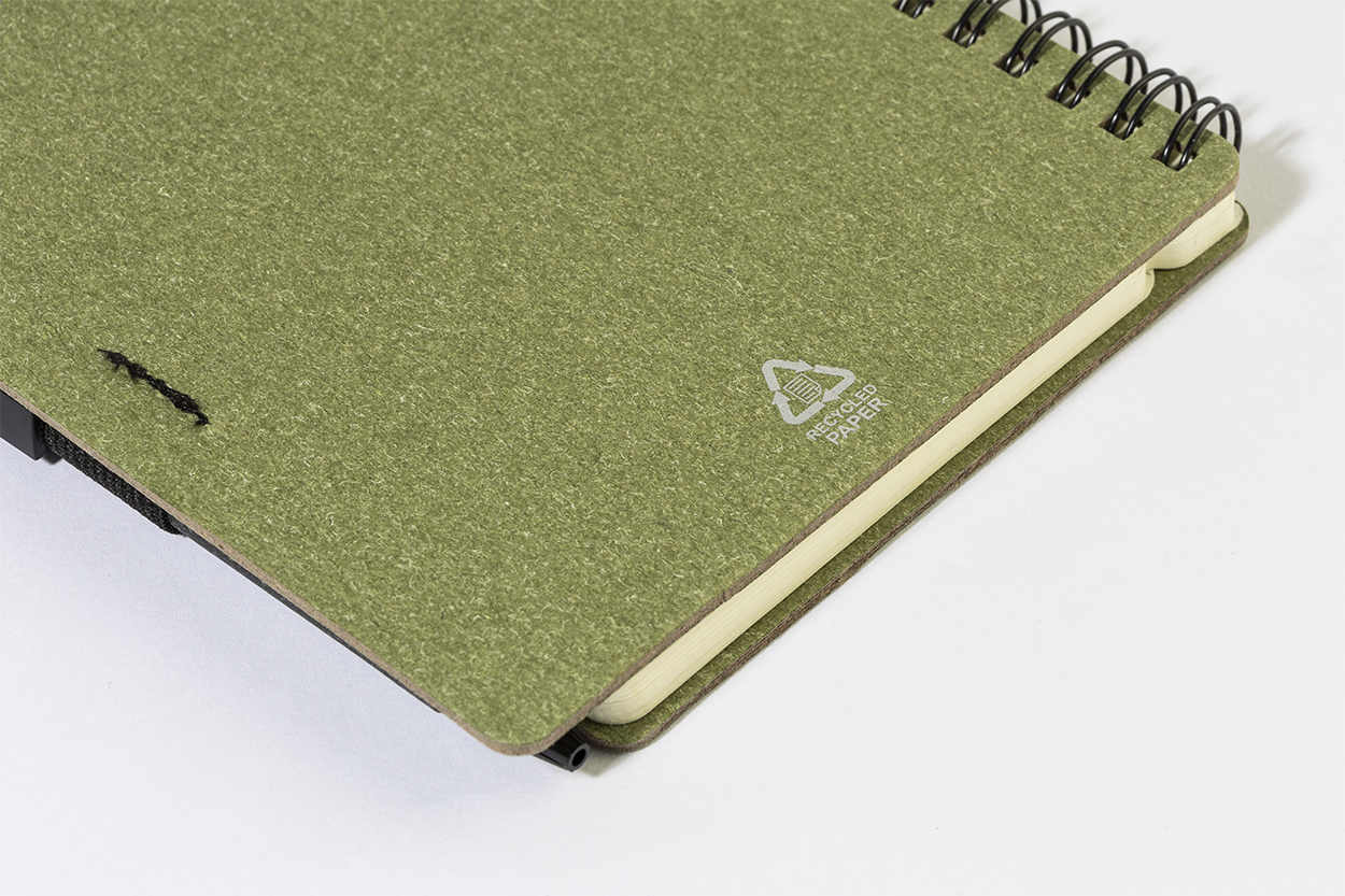 Spiralnotizbuch aus Recyclingpapier mit 80 Blättern (liniert). Format A6. Inklusive Recyclingpapier und Kugelschreiber aus Recycling-PP, blauschreibend.