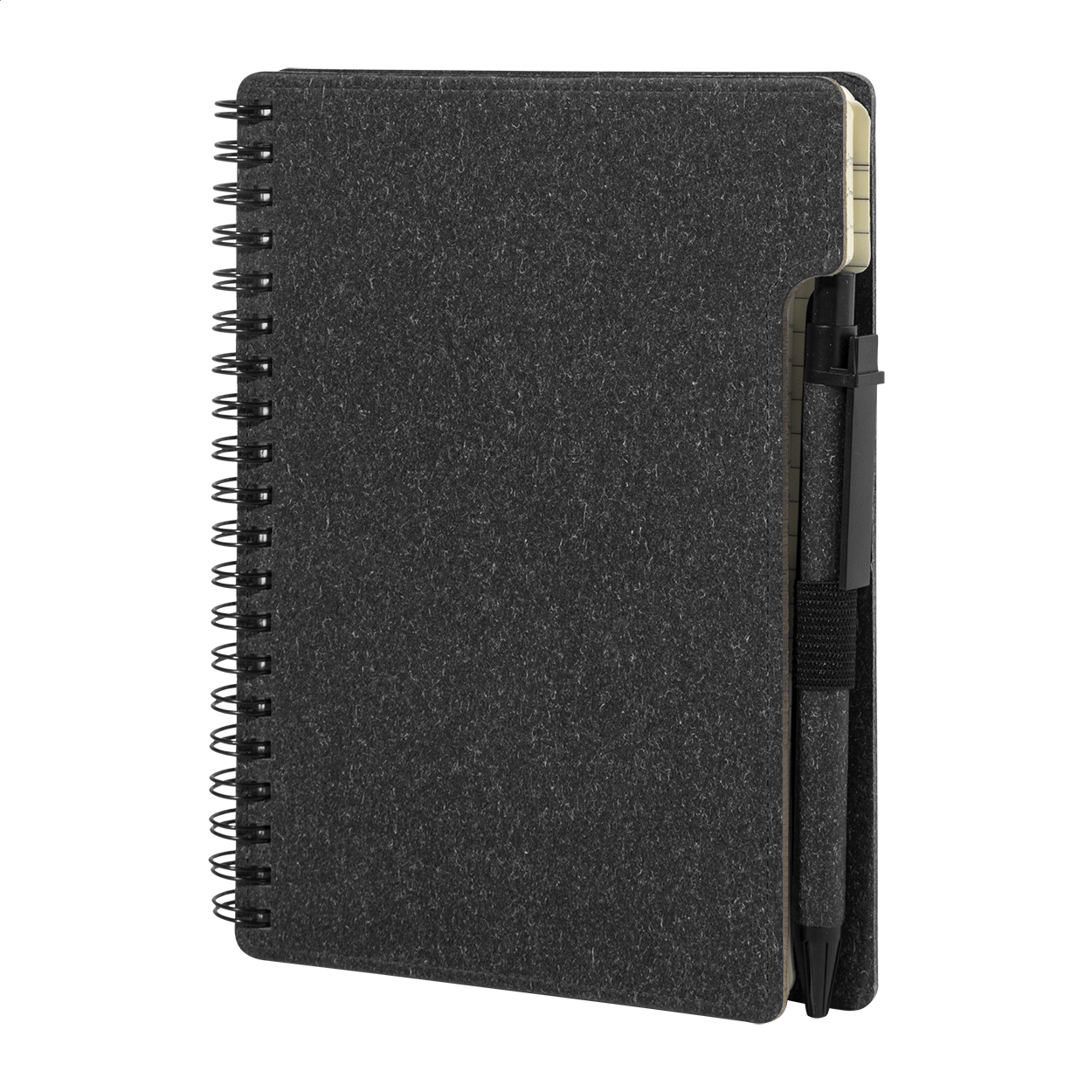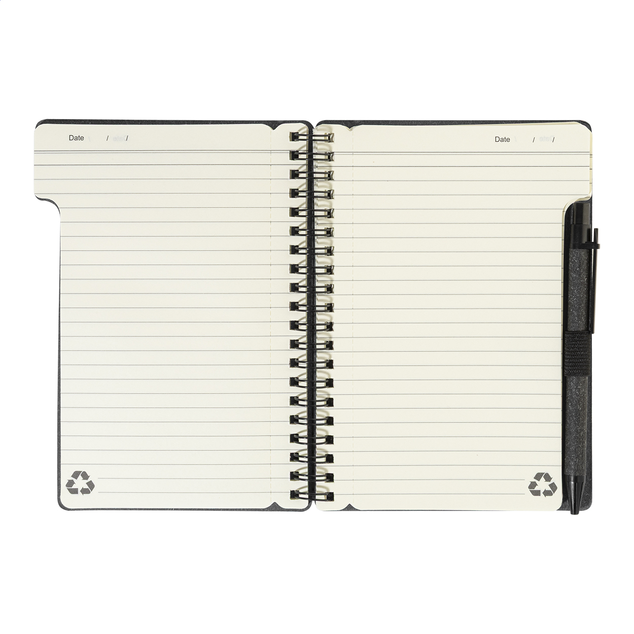 Spiralnotizbuch aus Recyclingpapier mit 80 Blättern (liniert). Format A6. Inklusive Recyclingpapier und Kugelschreiber aus Recycling-PP, blauschreibend.