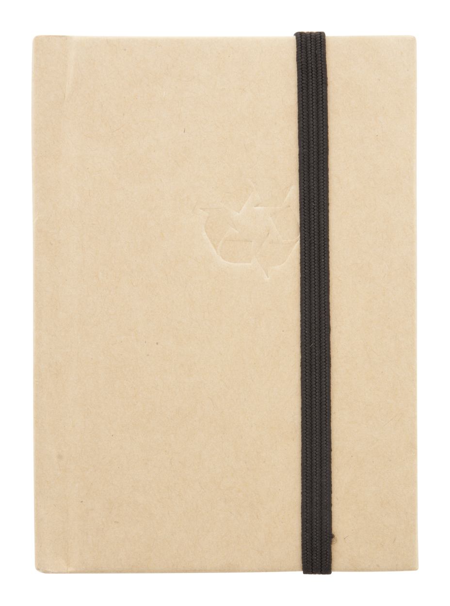 A7 Notizbuch aus Recycling Papier, 60 Seiten (liniert) mit Gummiband.