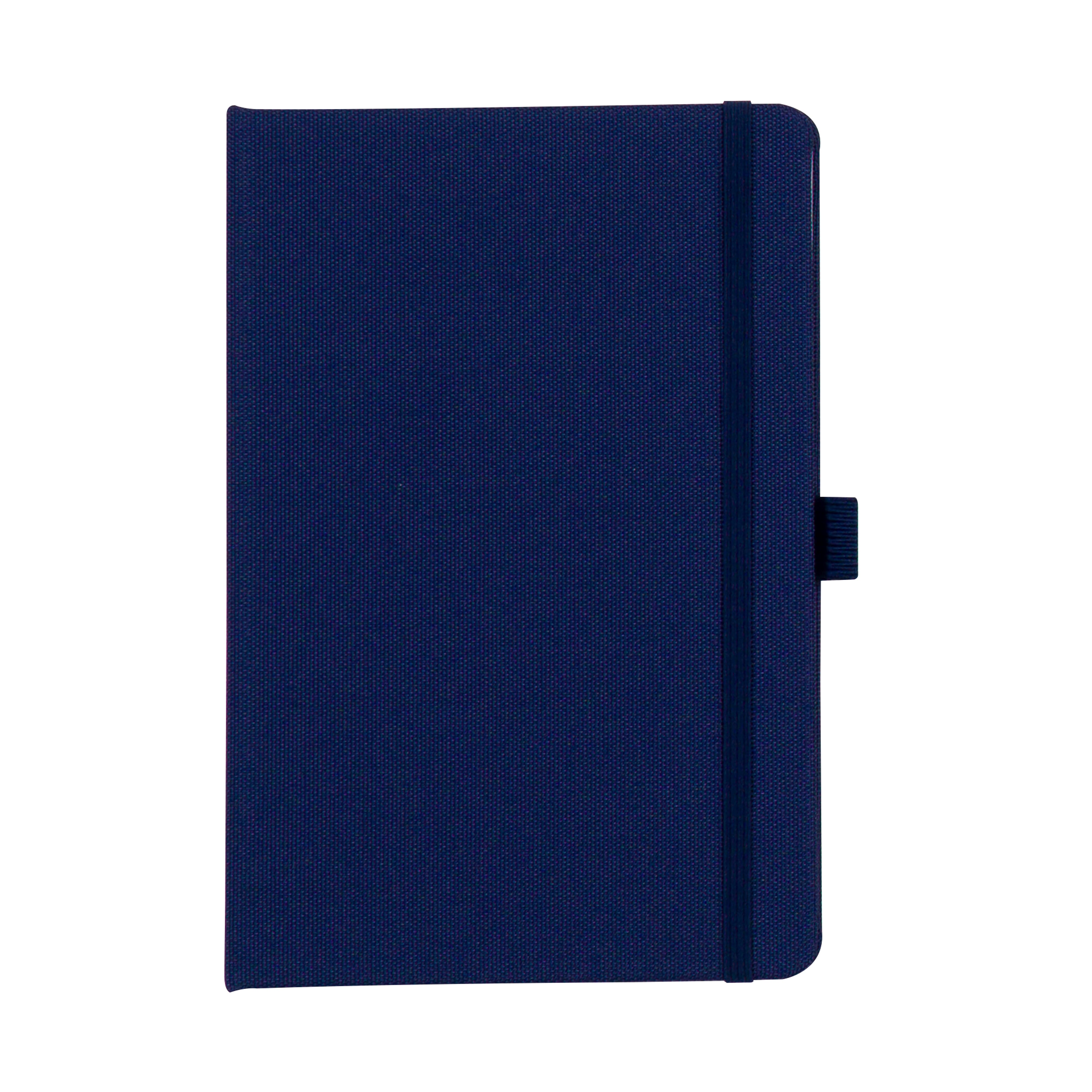 Hardcover DIN A5 Notizbuch aus R-PET-Material. Ein stilvolles und nachhaltiges Notizbuch, mit einer elastischen Stiftschlaufe und einem Gummiband zum verschließen des Notizbuches. Die 160 karierten Seiten sind aus Recyclingpapier.