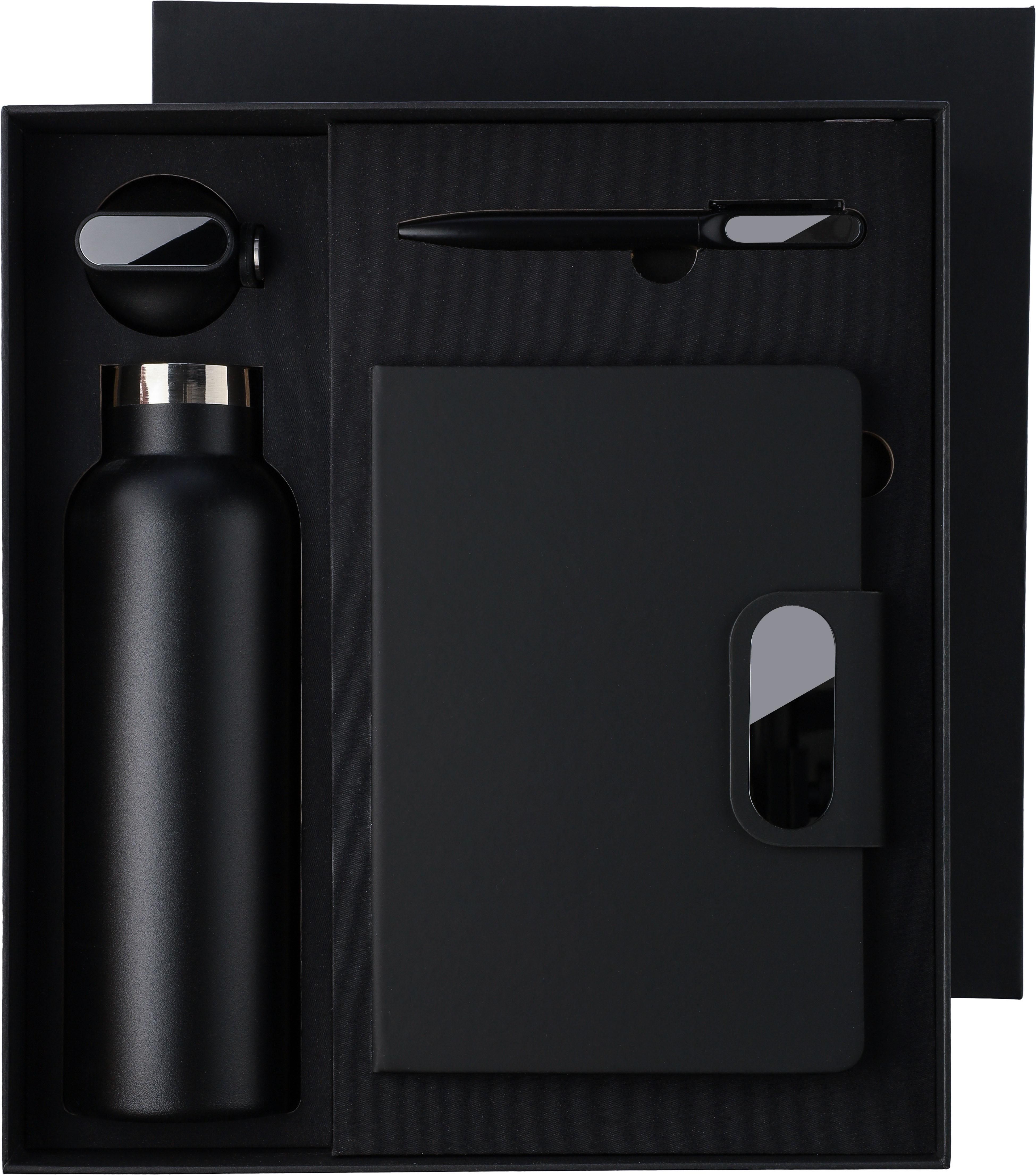 Dieses Geschenkset aus Karton besteht aus einer doppelwandigen Trinkflasche aus recyceltem Edelstahl (304) mit Silikongriff, einem Drehkugelschreiber aus recyceltem Aluminium mit blauer Tinte sowie einem Notizbuch aus recyceltem PU mit 80 Blatt 70 g / m² liniertem FSC-Papier. Das Notizbuch verfügt über ein Lesezeichen mit Band sowie einen magnetischen Metallverschluss mit Gravurplatte aus Rotguss. Alle Artikel sind mit einem recycelten Logo versehen: Es ist auf der Flasche und dem Kugelschreiber eingraviert und auf dem Notizbuch geprägt.