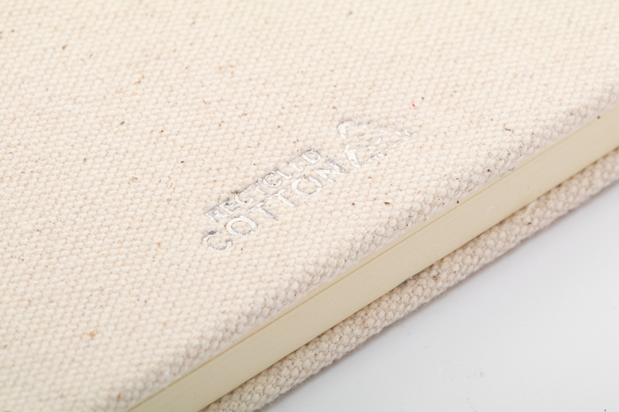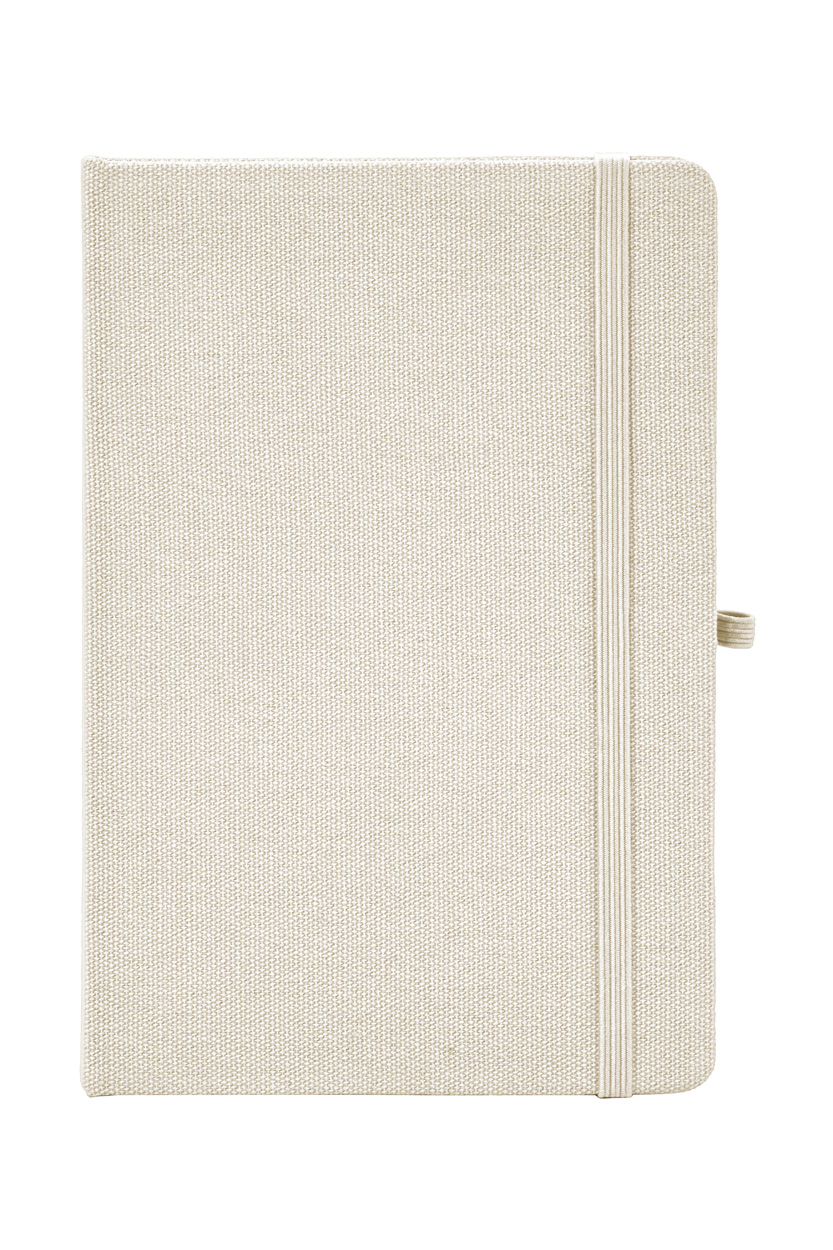 Notizbuch mit Einband aus recycelter Baumwolle und 80 linierten Blättern aus Recyclingpapier. Mit farblich passendem Lesezeichen, Gummiband und Stifthalter. A5-Größe.