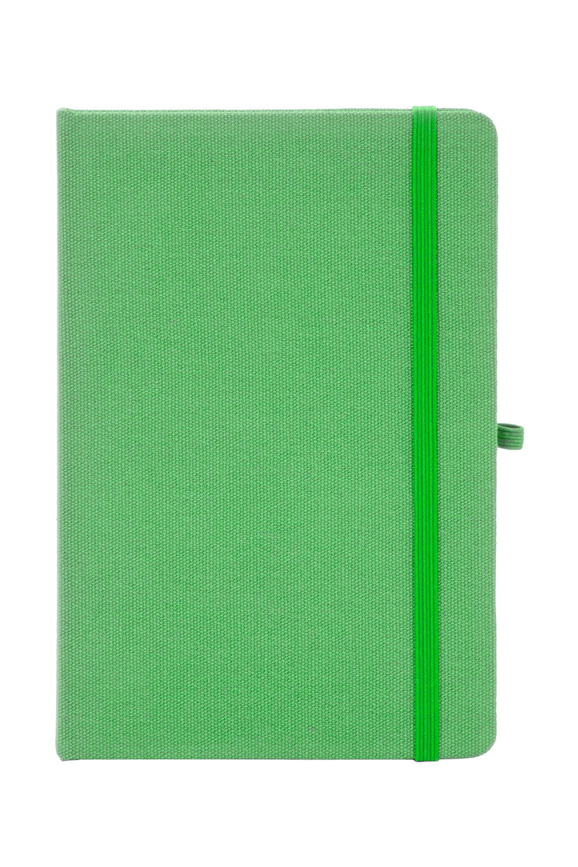 Notizbuch mit Einband aus recycelter Baumwolle und 80 linierten Blättern aus Recyclingpapier. Mit farblich passendem Lesezeichen, Gummiband und Stifthalter. A5-Größe.