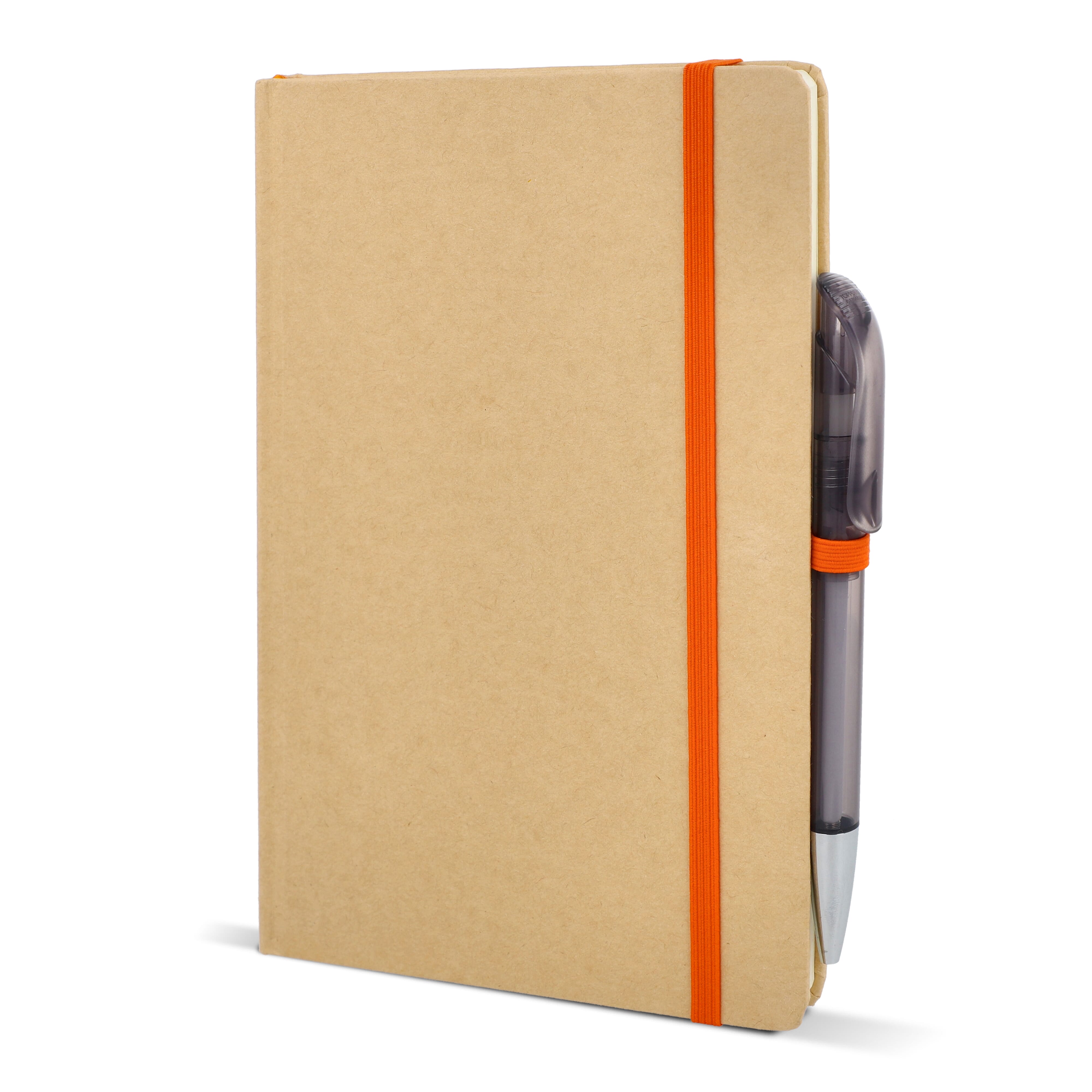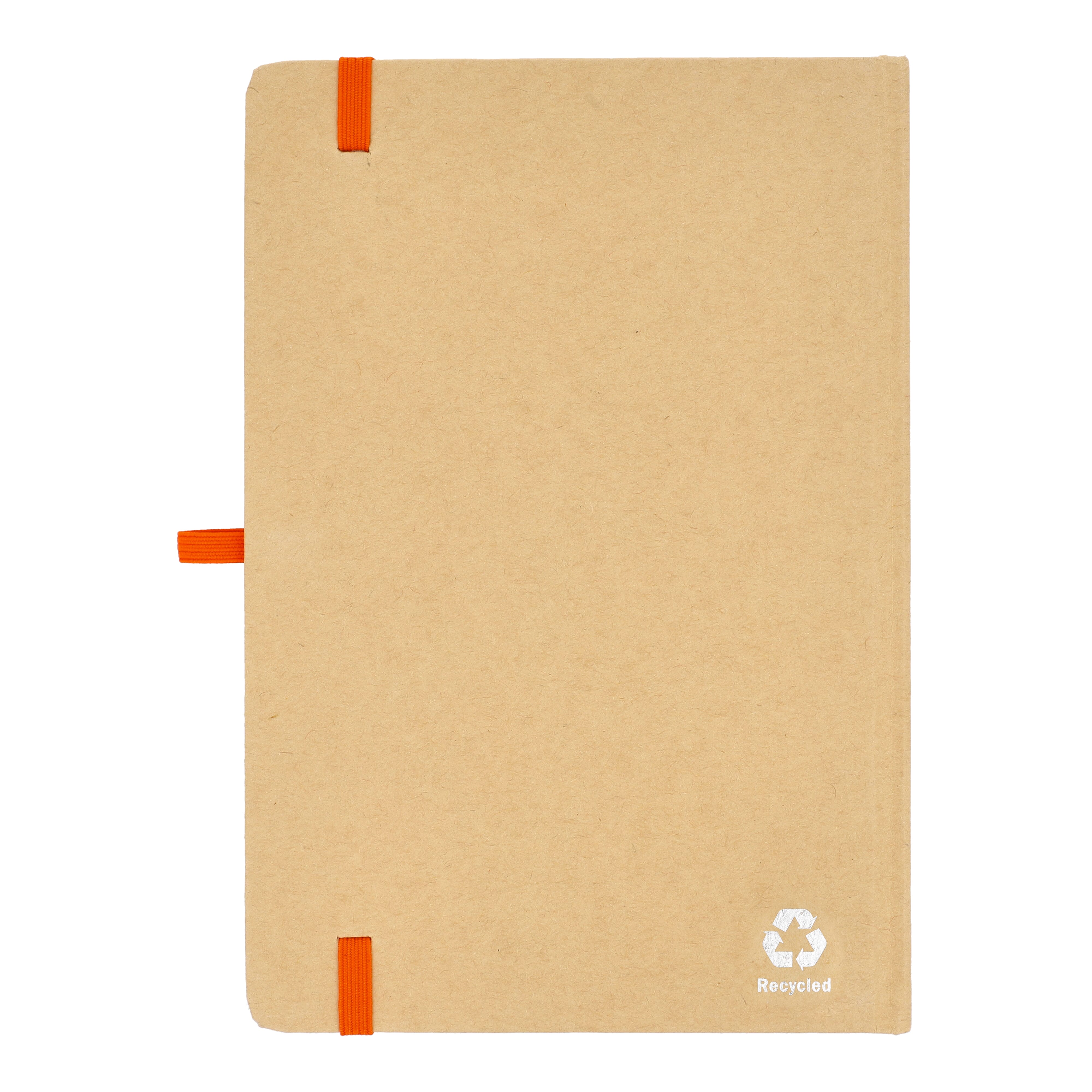 A5-Notizbuch mit Kartoneinband, abgerundeten Ecken, farbigem Gummiverschluss, Lesebändchen und Stiftschlaufe. Enthält 80 linierte cremefarbene Blätter aus Recyclingpapier. Eine praktische, umweltbewusste Wahl für den täglichen Gebrauch.