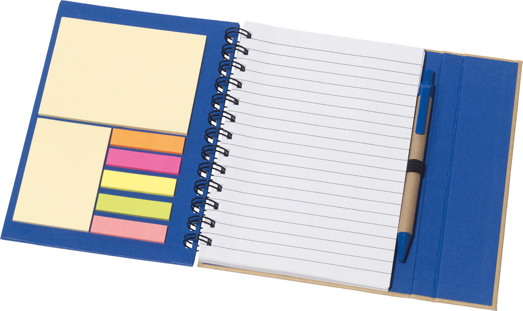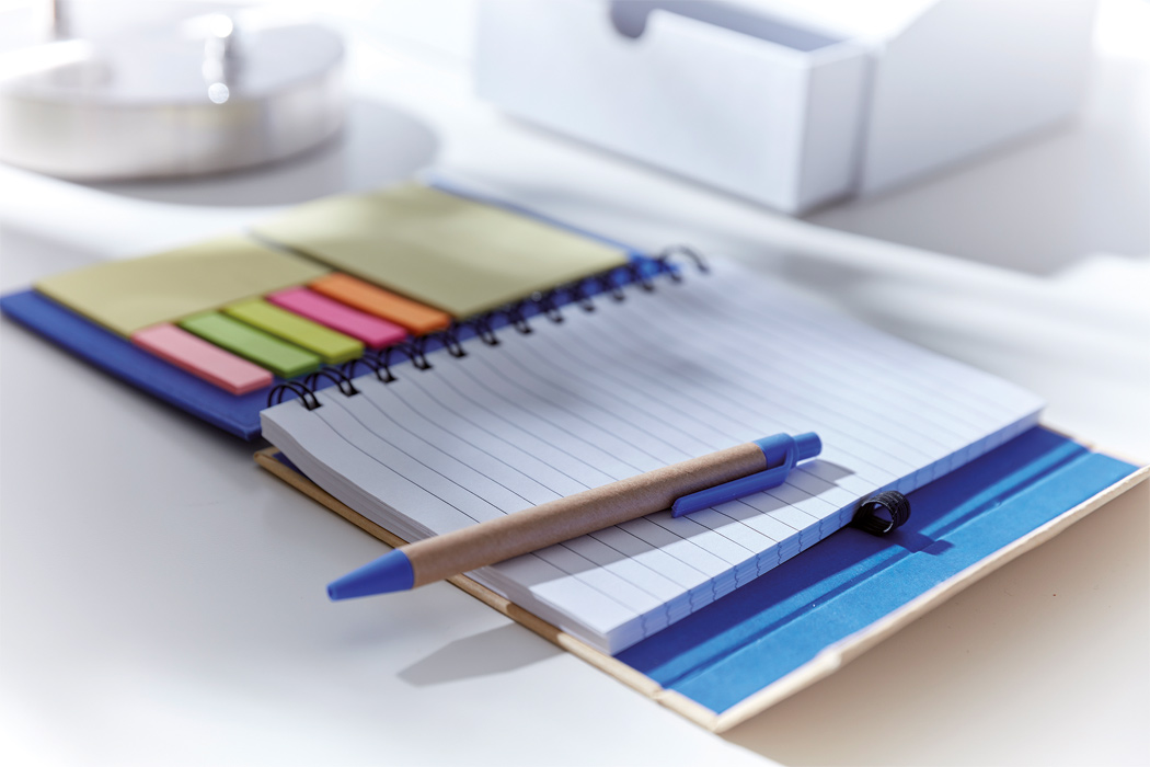 Notizbuch MAGNY: linierter Schreibblock mit Ringlochung, 2 Klebenotizzettelblöcke, 5 verschiedenfarbige Klebenotizstreifen, inkl. Kugelschreiber (schwarzschreibend), magnetischer Verschluss, recycelbar
