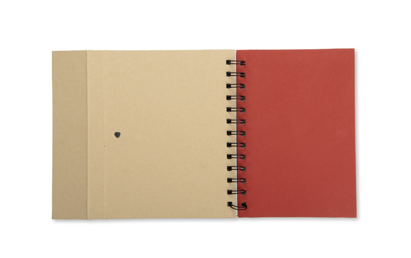 Spiralnotizbuch mit Magnetverschluss. 70 Blatt schwarz-liniert. Haftnotizen 25 Blatt. Inklusive Kugelschreiber. Das Logo wird mit der Tampondruckmethode.
