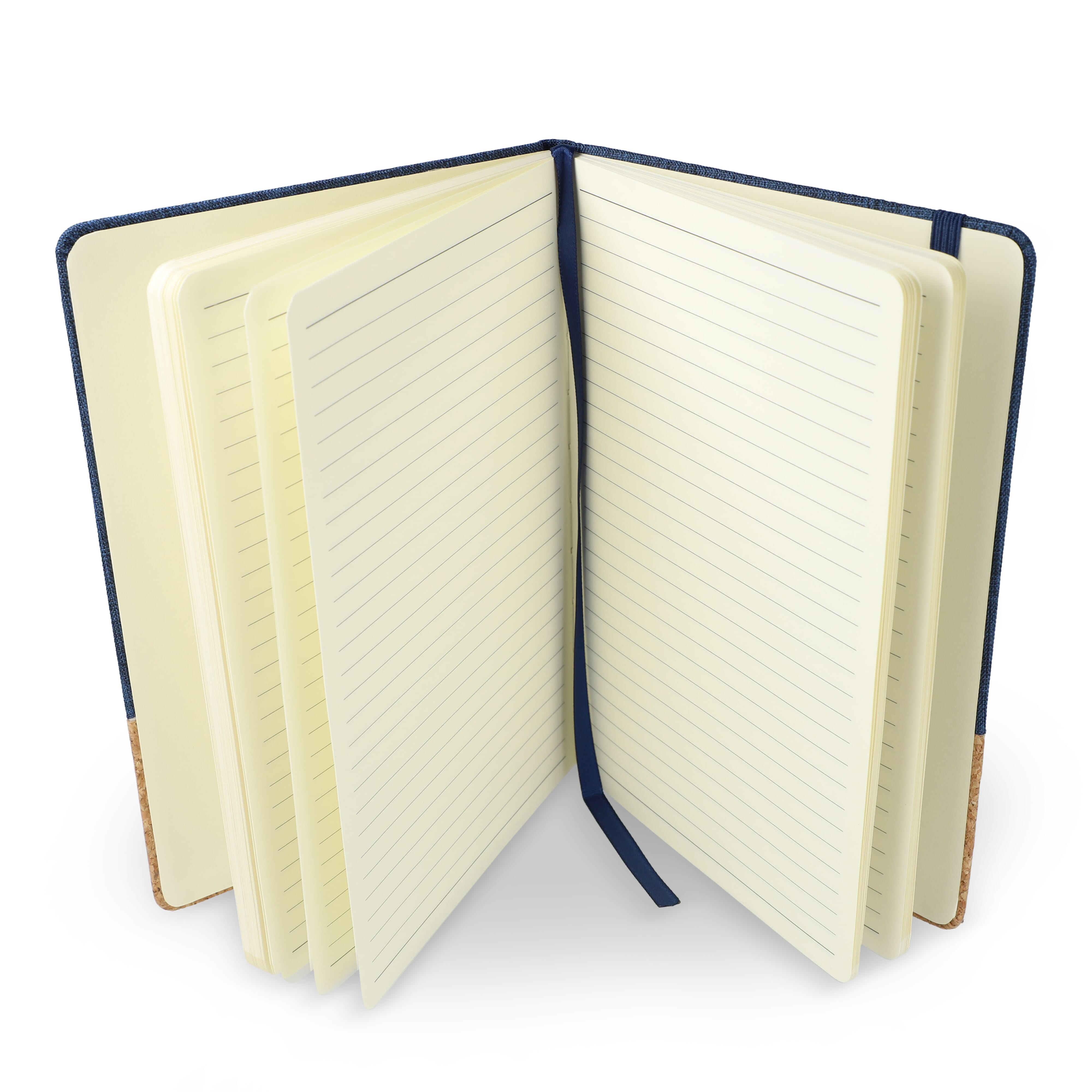 Dieses Notizbuch hat einen Einband aus recyceltem PET und Kork mit 80 linierten 70-Gramm-Blättern aus FSC-zertifiziertem Papier. Es verfügt über einen Gummibandverschluss und ein Lesezeichen-Band für zusätzlichen Komfort. Hergestellt aus R-PET