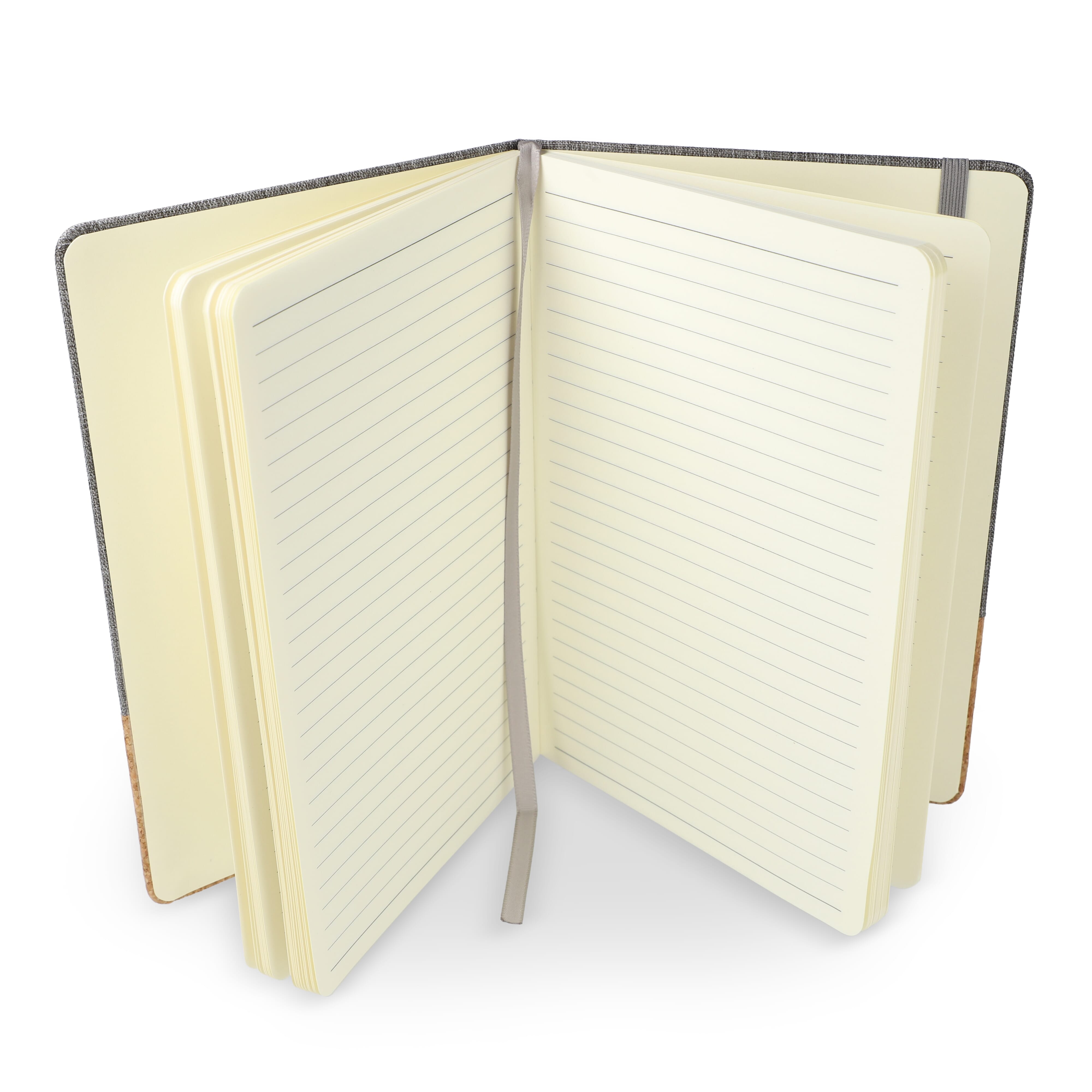 Dieses Notizbuch hat einen Einband aus recyceltem PET und Kork mit 80 linierten 70-Gramm-Blättern aus FSC-zertifiziertem Papier. Es verfügt über einen Gummibandverschluss und ein Lesezeichen-Band für zusätzlichen Komfort. Hergestellt aus R-PET