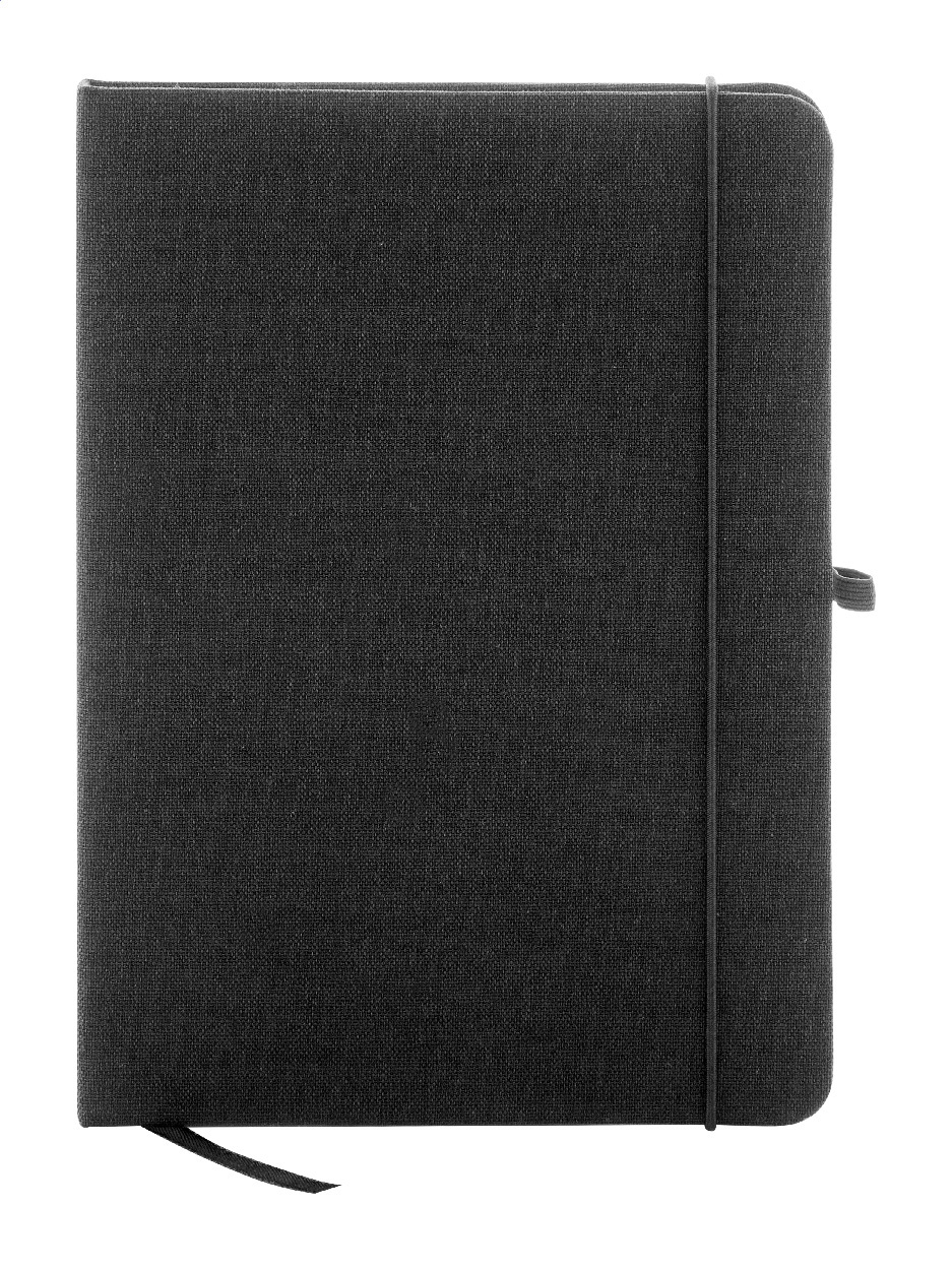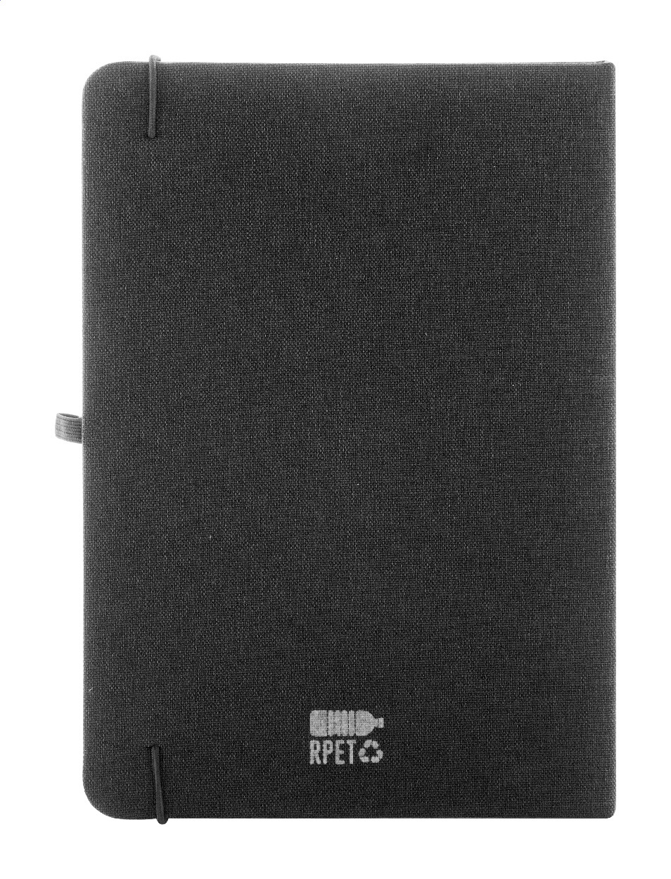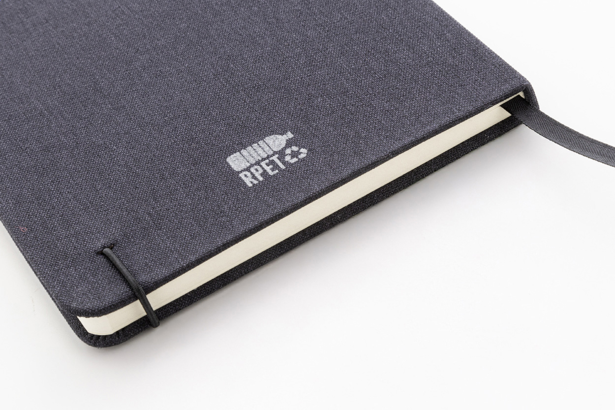 A5 Notizbuch mit Cover aus 300D RPET Polyester mit 80 blanko Seiten und farblich abgestimten Gummiband, Lesezeichen sowie Stifteschlaufe.