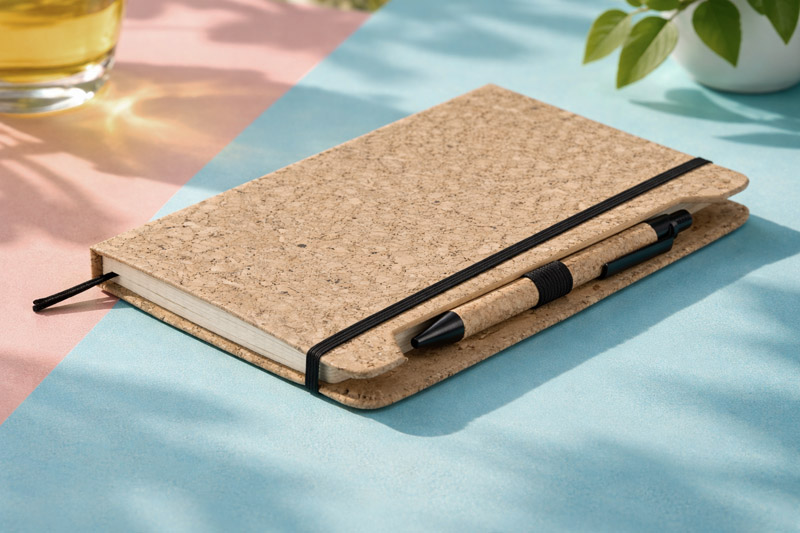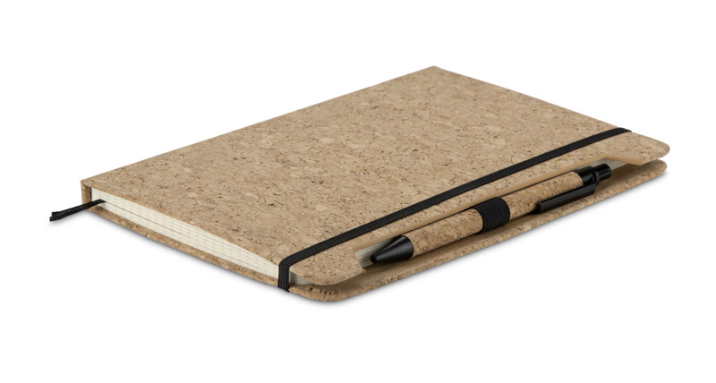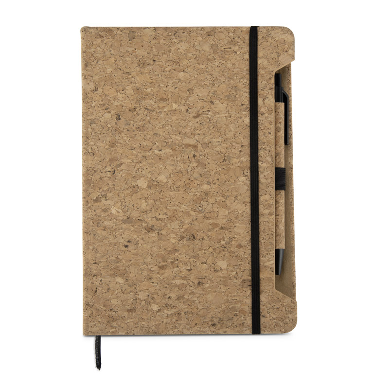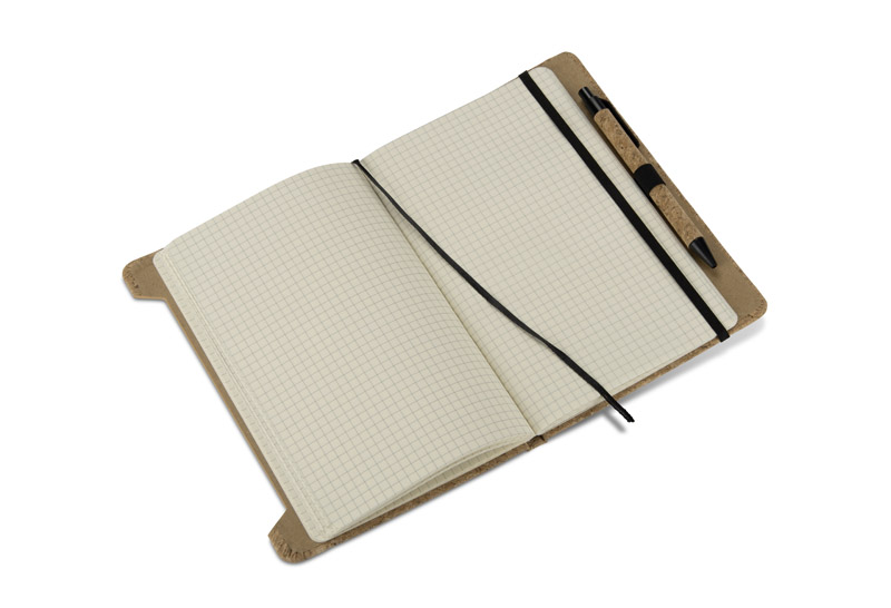 Das SKRIP A5-Notizbuch fällt durch seinen Einband aus Naturkork mit einer klaren, organischen Struktur auf. Es wird mit einem Stift geliefert, der teilweise aus demselben Material besteht, was ein kohärentes und auffälliges Ganzes ergibt. Im Inneren befinden sich 80 weiß karierte Seiten (70 g / m²), die mit einem Gummiband gesichert sind. Das Notizbuch ist genäht, damit es sich bequem aufklappen und benutzen lässt. Funktional und stilvoll - perfekt für Werbepakete oder als individuelles Werbegeschenk.