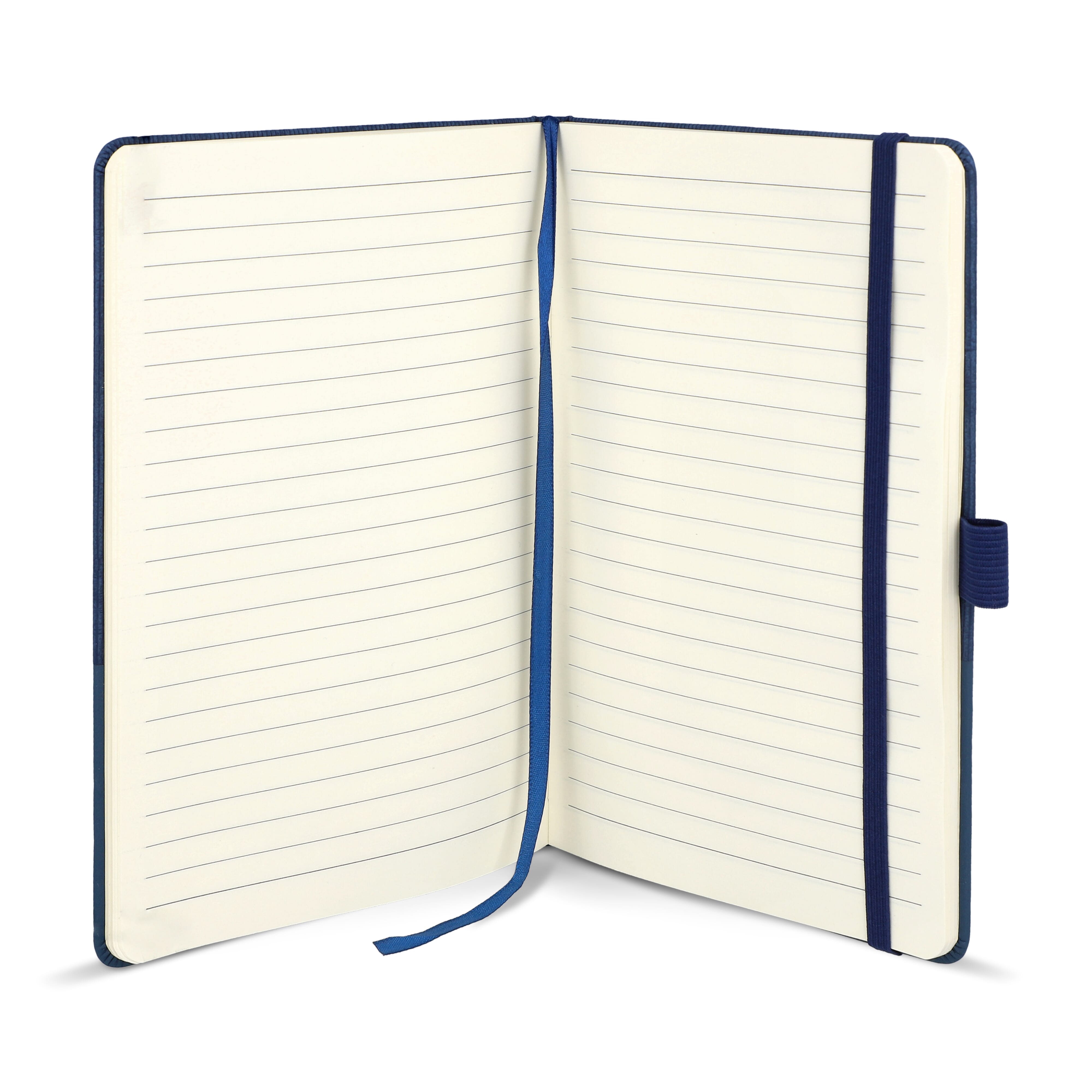 A5-Notizbuch aus Thermo-PU-Kunstleder mit modernem, hochwertigem Look. Ausgestattet mit einem elastischen Verschlussband, Lesebändchen und Stiftschlaufe. Es hat 80 linierte, cremefarbene Blätter aus FSC-zertifiziertem Papier.