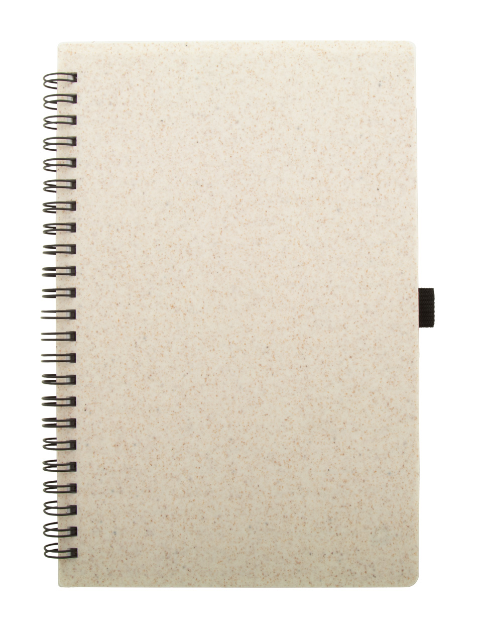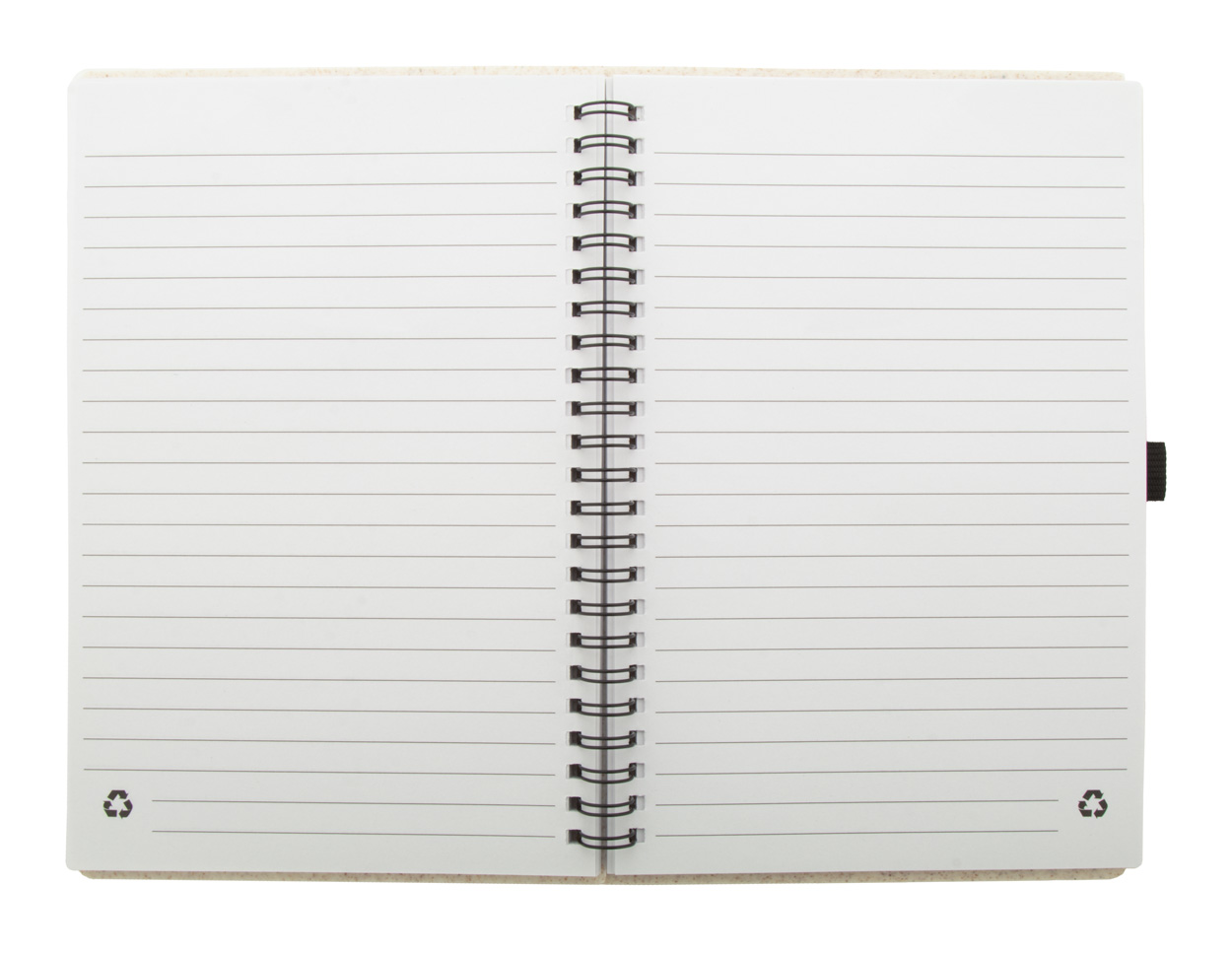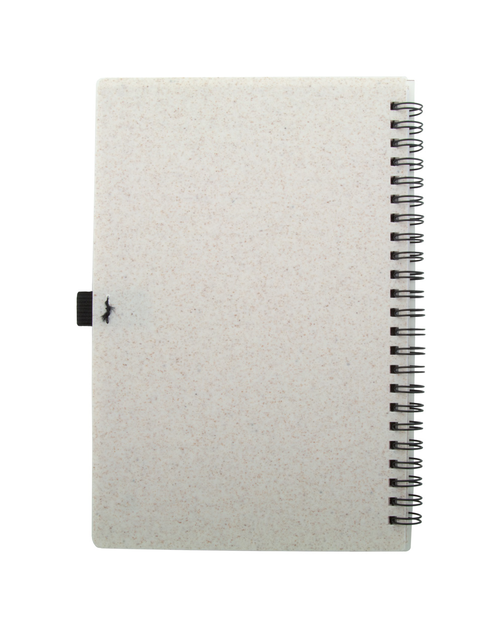 Ökologisches Spiral-Notizbuch mit Weizenstroh-Kunststoffüberzug, 70 linierten Blättern aus Recyclingpapier und Stifthalter im A5-Format.