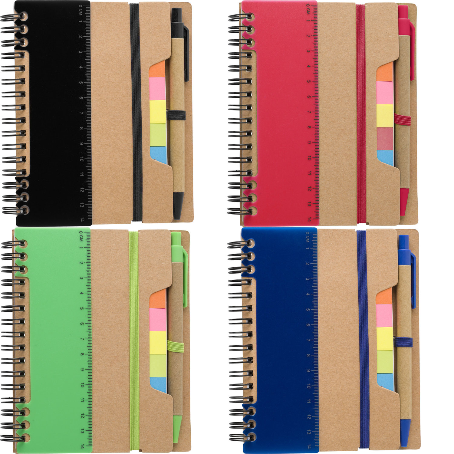 Notizbuch aus recyceltem Papier mit Ringbindung und 60 linierten Seiten. Haftnotizen in 5 Farben, Lineal und einem Rollerball.