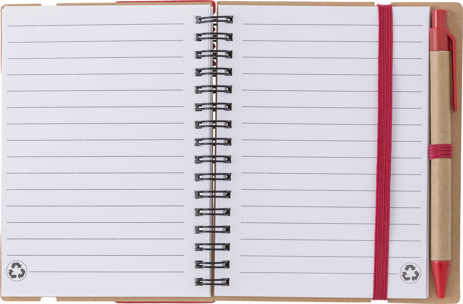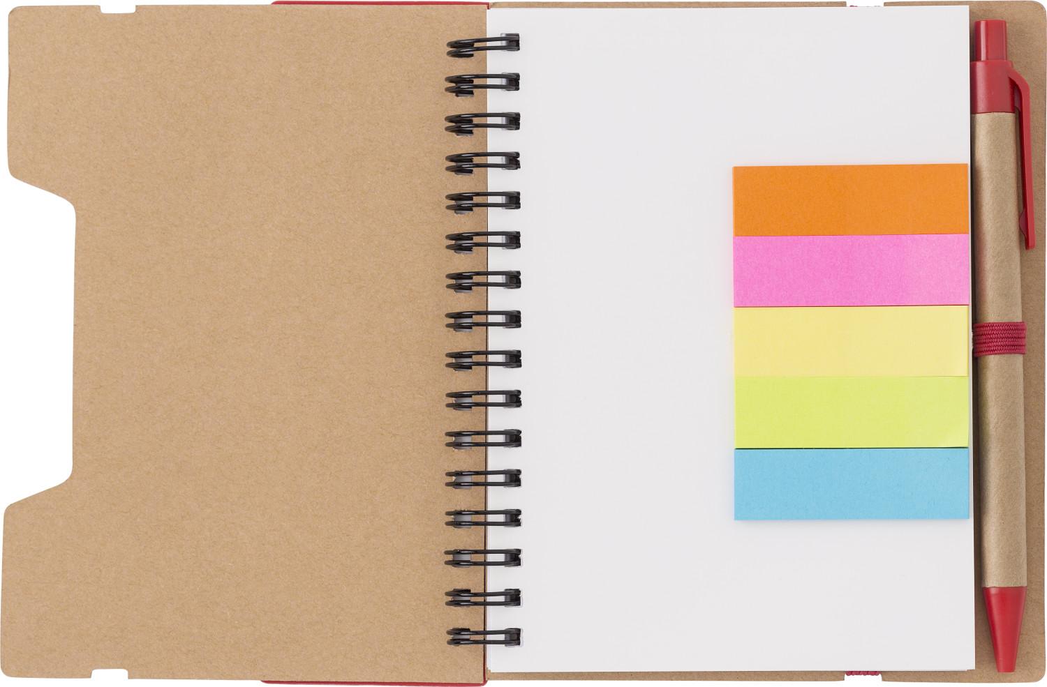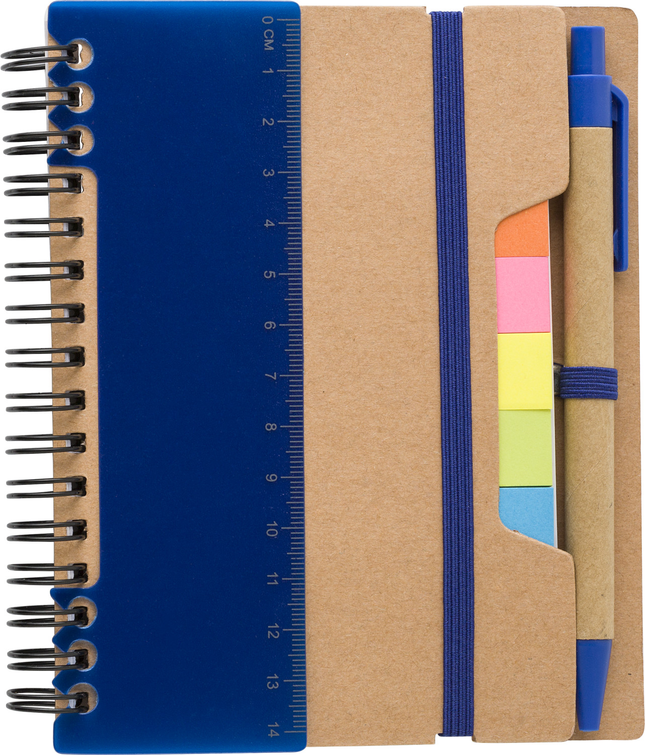 Notizbuch aus recyceltem Papier mit Ringbindung und 60 linierten Seiten. Haftnotizen in 5 Farben, Lineal und einem Rollerball.