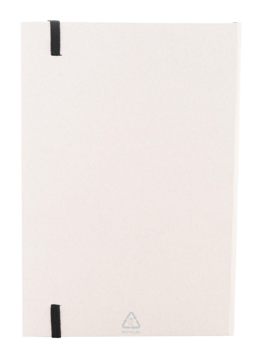Notizbuch aus recyceltem Milchkartonpapier mit festem Einband, 80 linierten Blättern und farblich passendem Gummiband. Format A5.