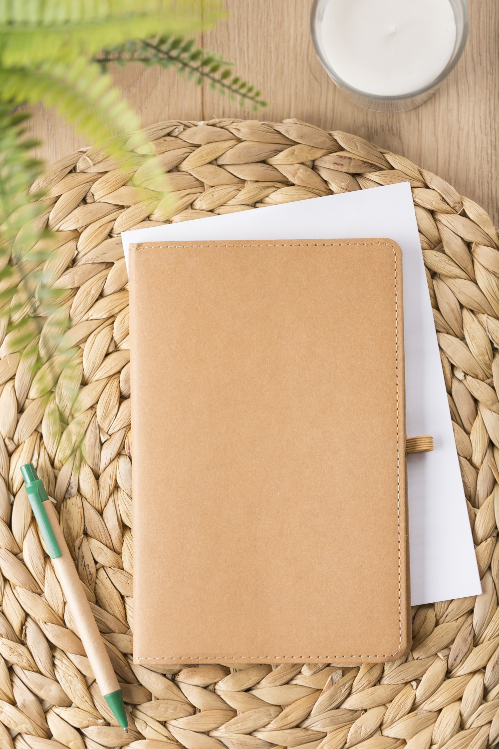 Gewaschenes Kraftheft (ca. A5), mit 96 linierten Seiten.
