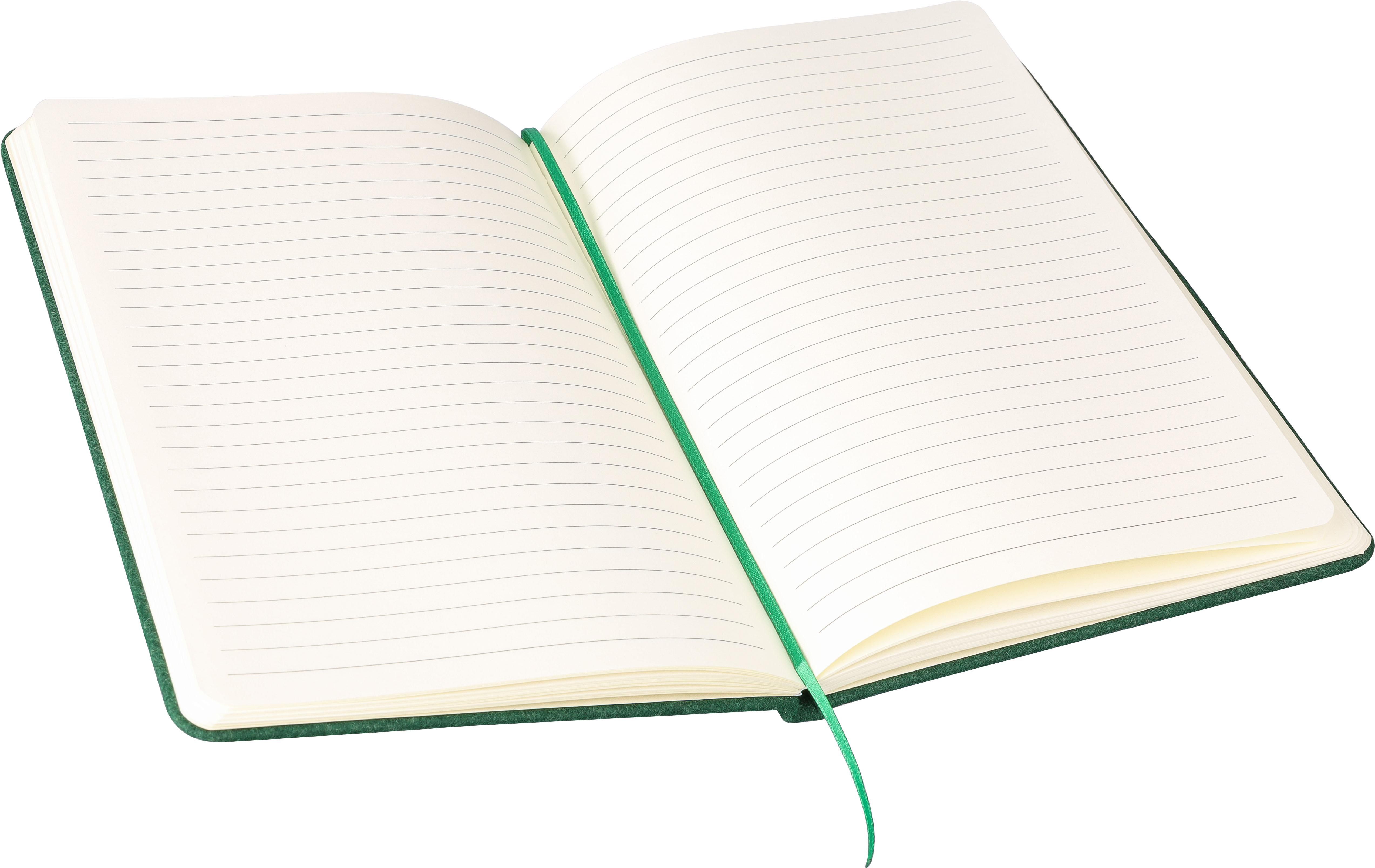 Recycling-Filz-Notizbuch (ca. A5) mit weichem, 1 mm starkem Hardcover, Gummiband und PU-Verschlusslasche auf der Außenseite. Es ist inklusive Lesezeichen und 80 Blatt (70 g / m²) liniertem Papier. Auf der Rückseite befindet sich ein lasergraviertes Recycling-Logo.
