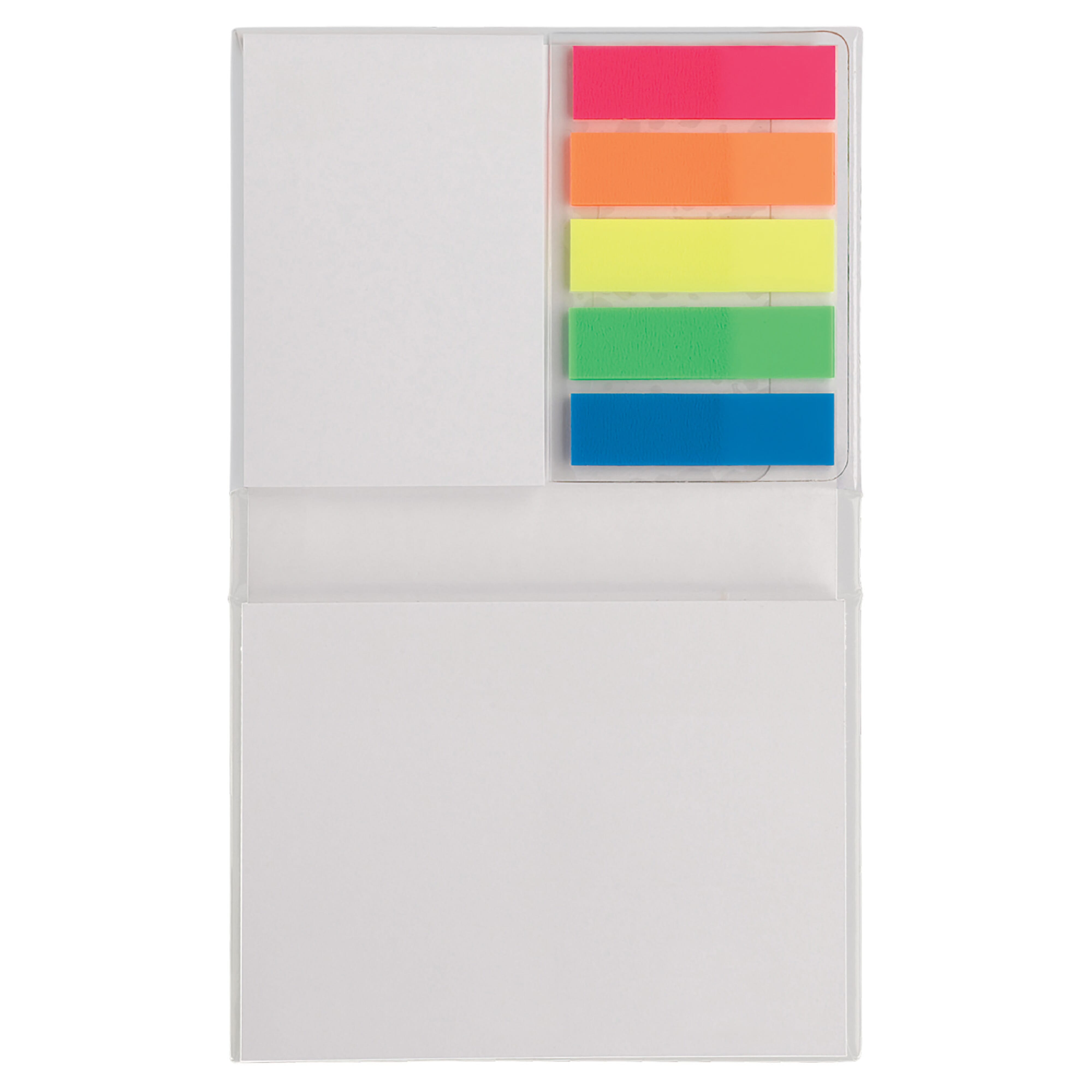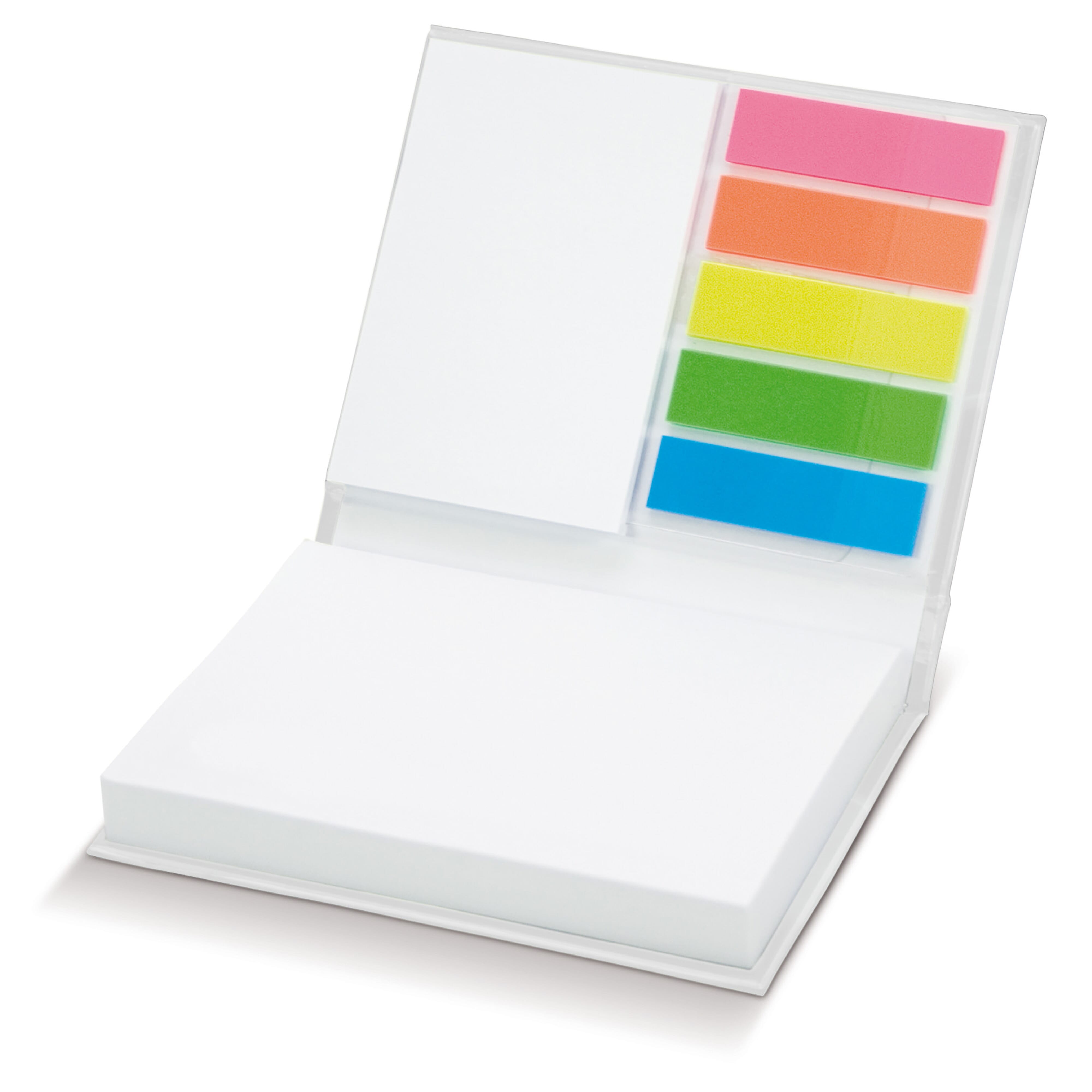 Praktischer Notizblock mit 100 selbstklebenden großen Memoblättern (100 x 75 mm) und 25 kleinen selbstklebenden Memoblättern (50 x 75 mm) sowie 5 x 25 farbige Memostreifen. Preis inkl. einem Fullcolor Druck auf dem Umschlag.