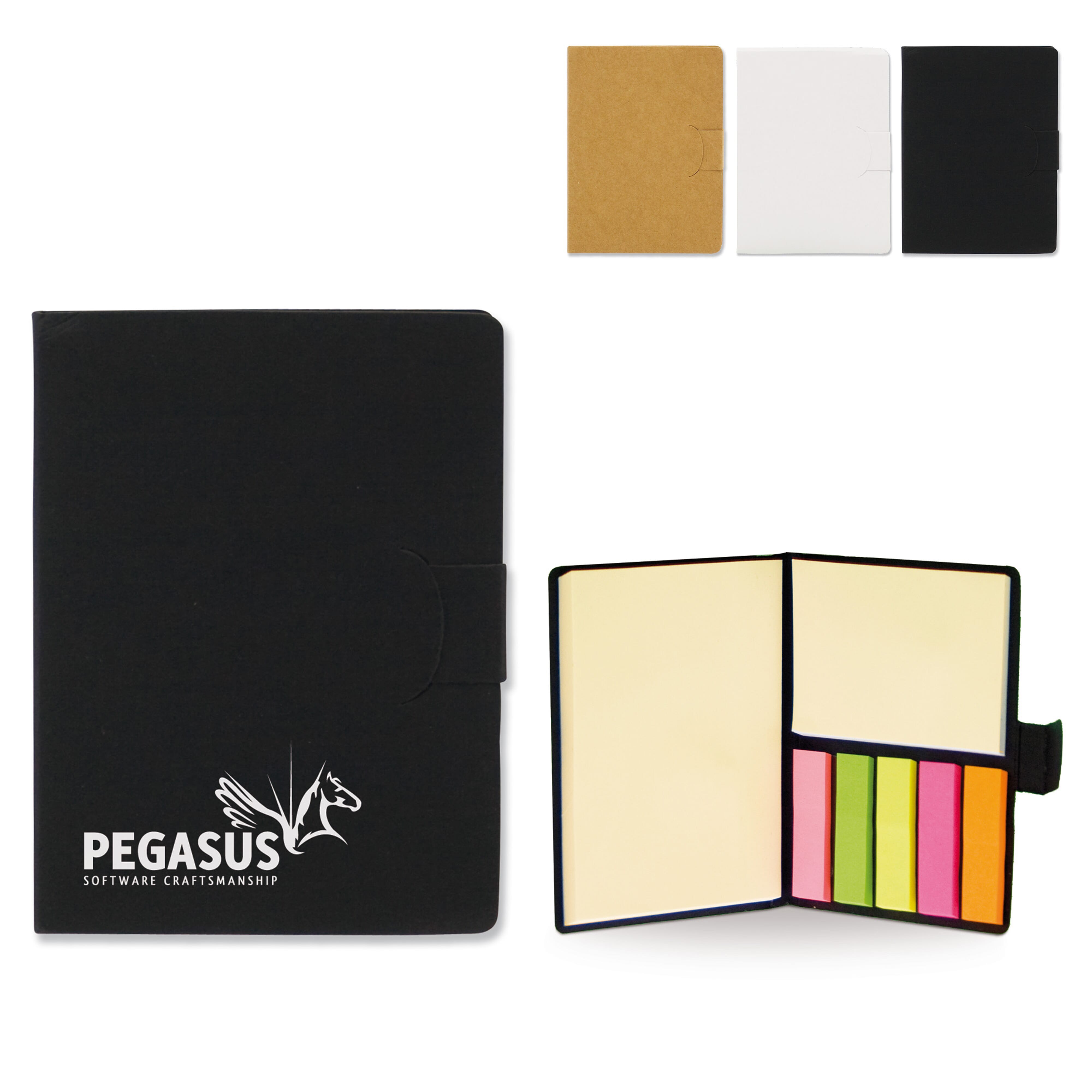 Kleines Notizbuch im Eco Design mit 2 selbstklebenden Memo- und 5 farbigen Haftnotizen.