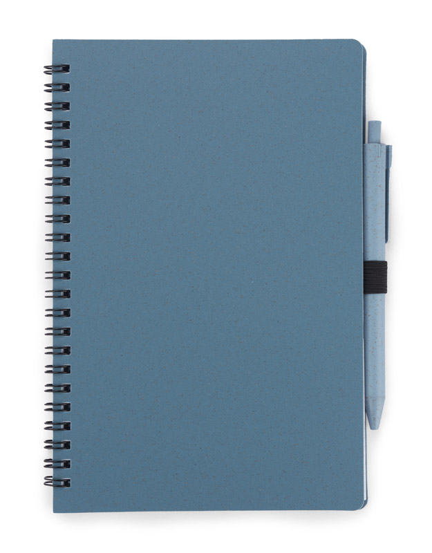 TRESA-Notizbuch mit Stift, farblich passend zum Einband. Der Stift und die Notizbuchhülle bestehen aus Weizenstroh. Ein Spiralnotizbuch mit 70 karierten Blättern aus Recyclingpapier. A5-Format. Blaue Kugelschreibermine.