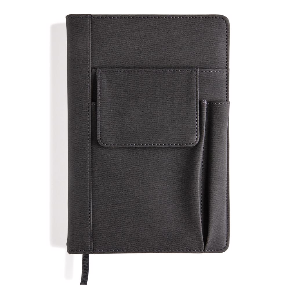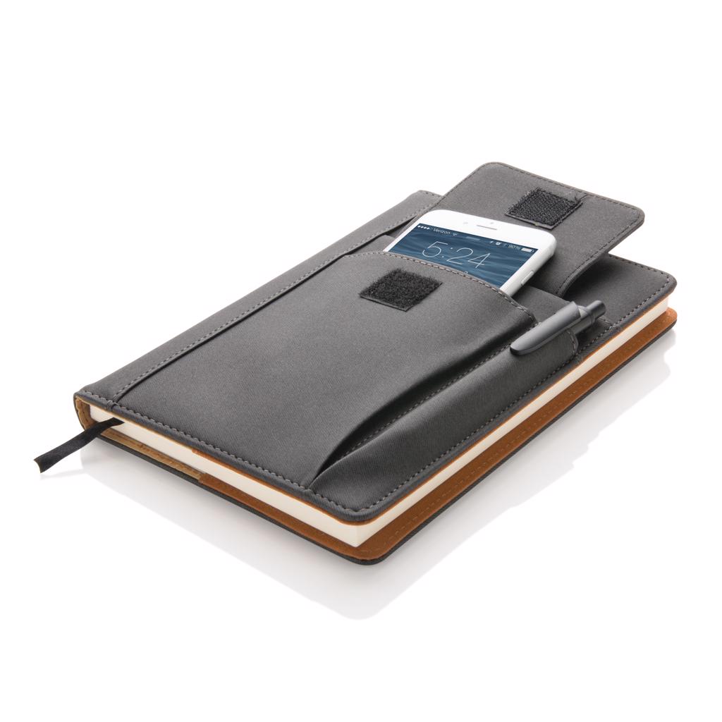 Beschichtetes PU Notizbuch mit Telefontasche (14 x 10 cm), Stifthalter und Hauptfach für z. B. eine Powerbank oder Visitenkarten. Schwarzer Seitenteiler und 160 linierten Seiten aus 80g / m2. Mit neuem A5 Notizbuch kann das Cover stets wiederverwendet werden.