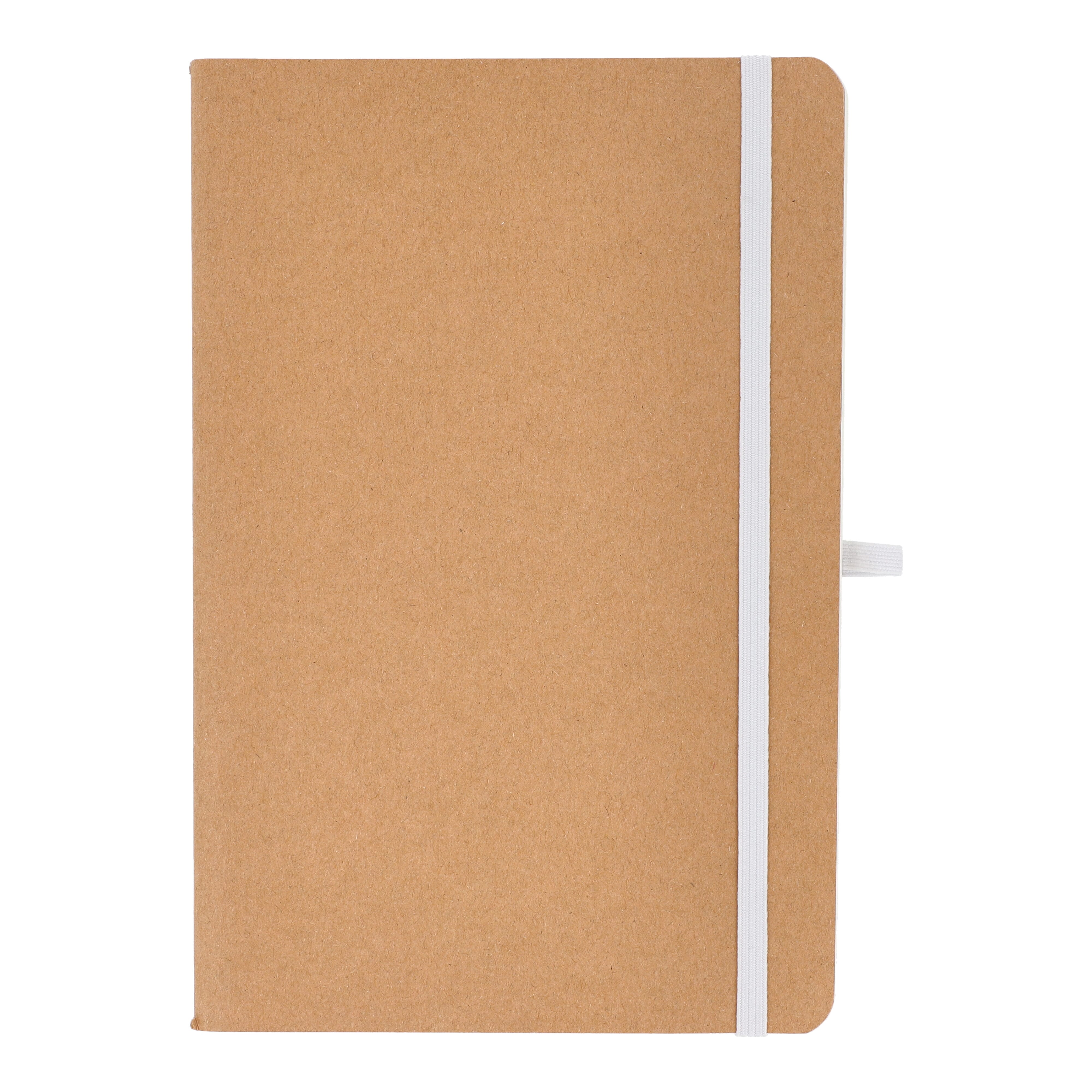 A5-Notizbuch mit weichem Kraftpapiereinband, abgerundeten Ecken, farbigem Gummiverschluss und Stiftschlaufe. Es hat 60 linierte cremefarbene Blätter aus FSC-zertifiziertem Papier. Eine praktische und natürlich wirkende Option für tägliche Notizen.