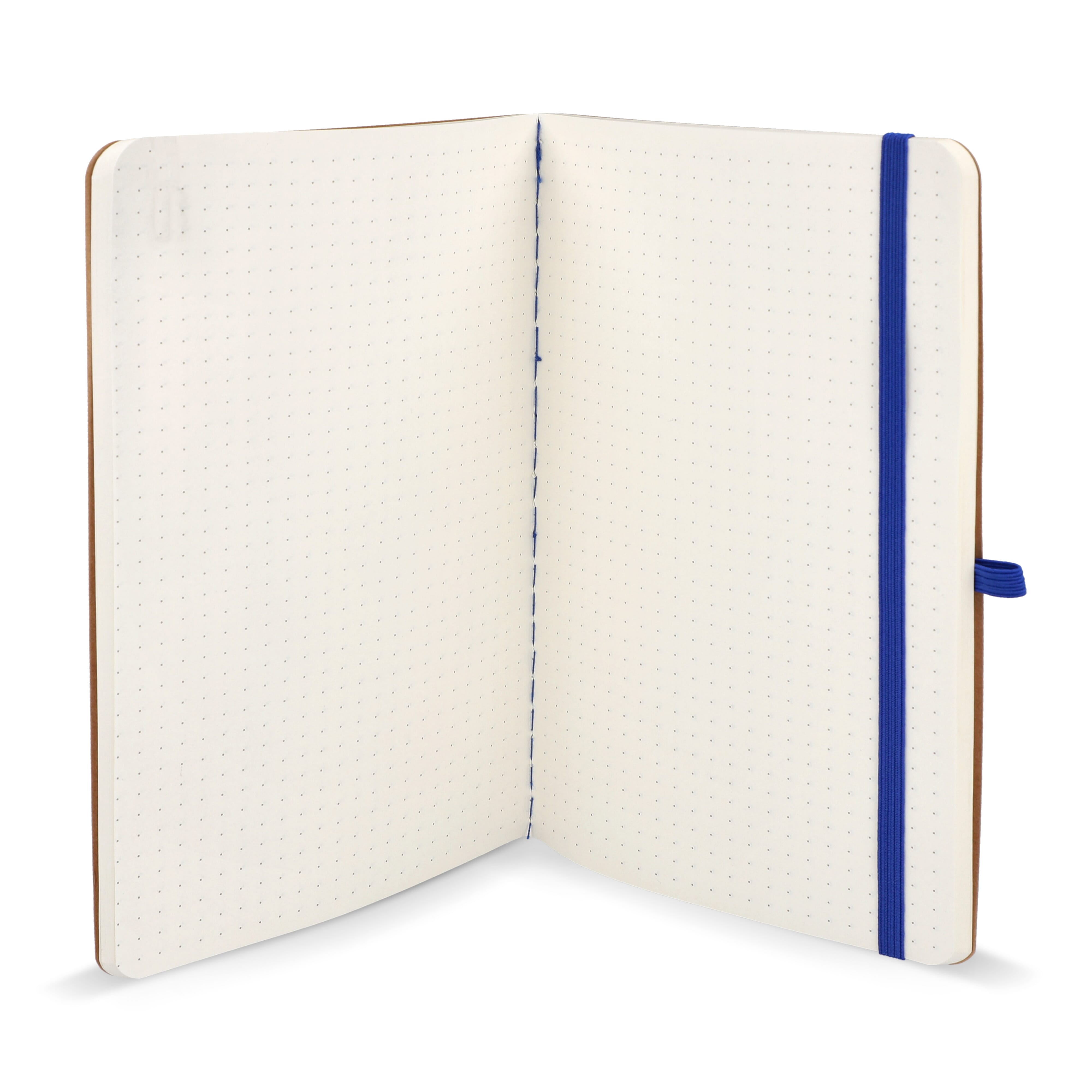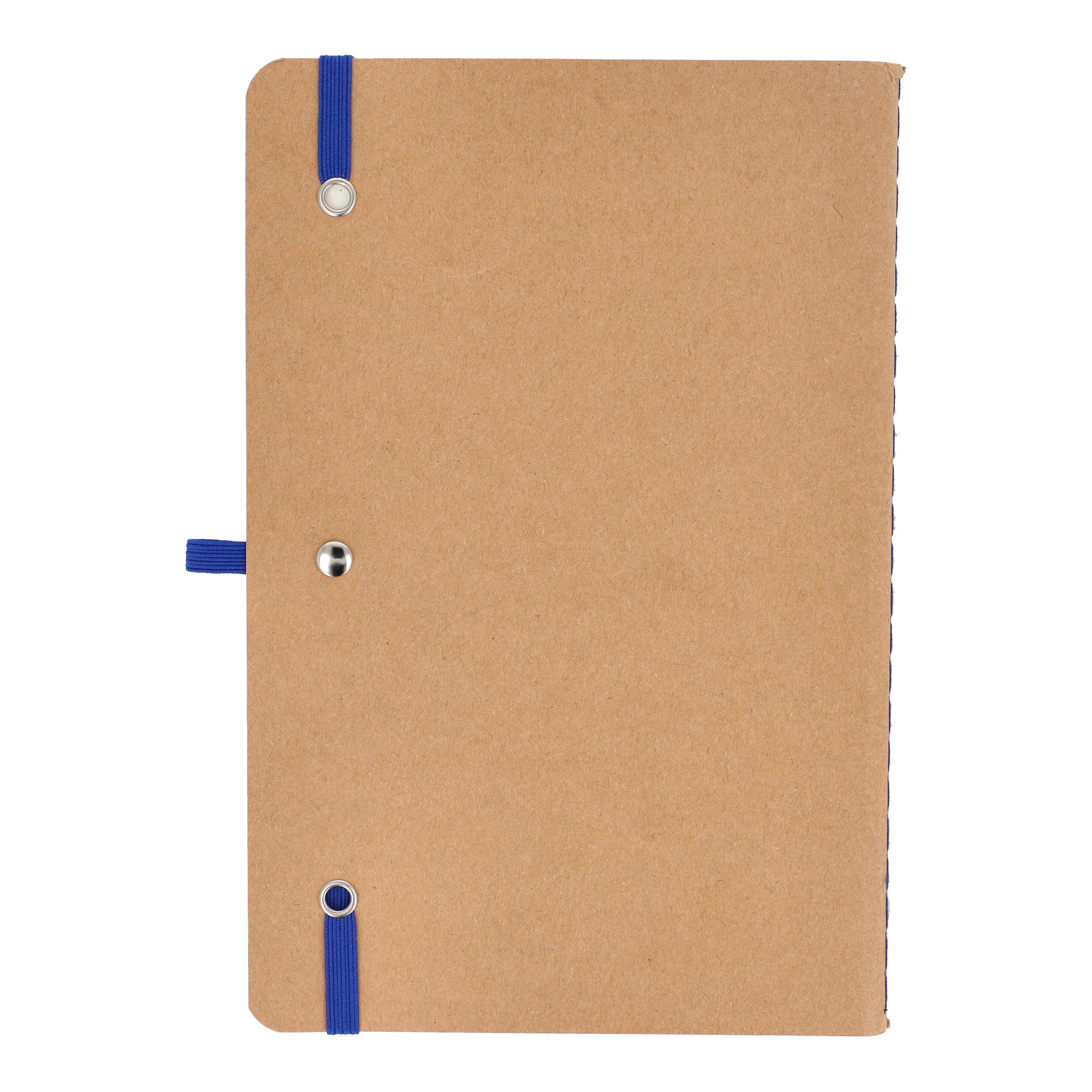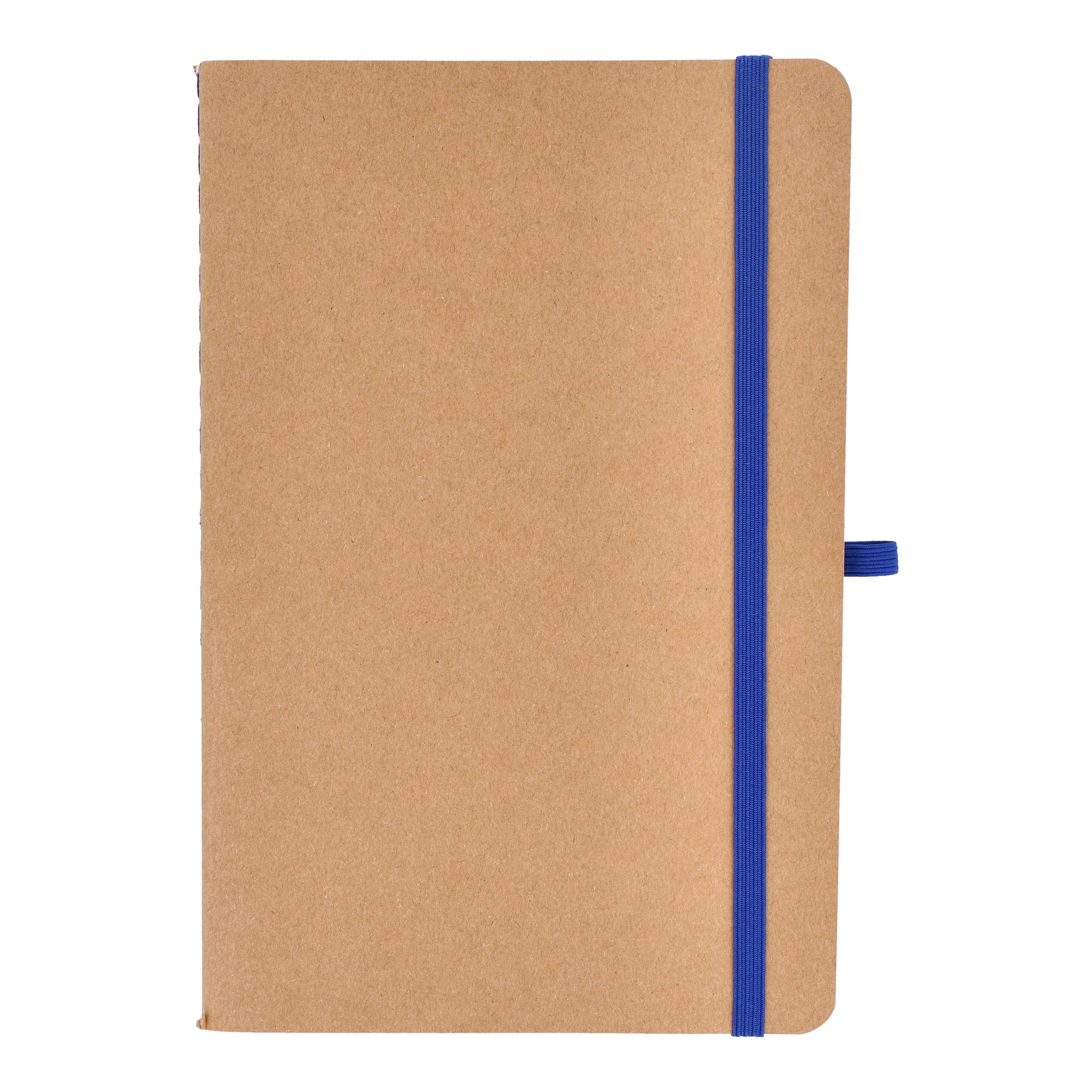 A5-Notizbuch mit weichem Kraftpapiereinband, abgerundeten Ecken, farbigem Gummiverschluss und Stiftschlaufe. Es hat 60 linierte cremefarbene Blätter aus FSC-zertifiziertem Papier. Eine praktische und natürlich wirkende Option für tägliche Notizen.