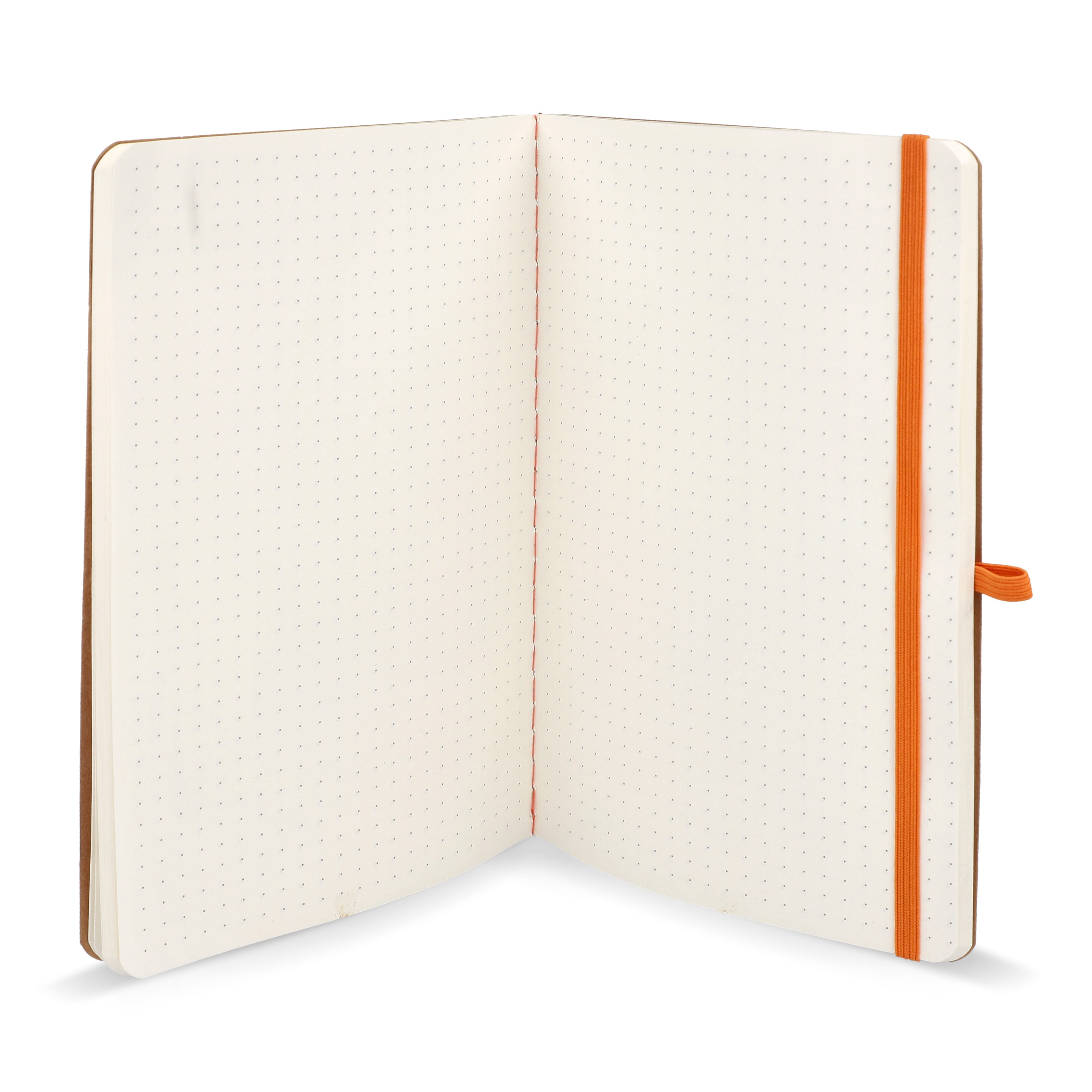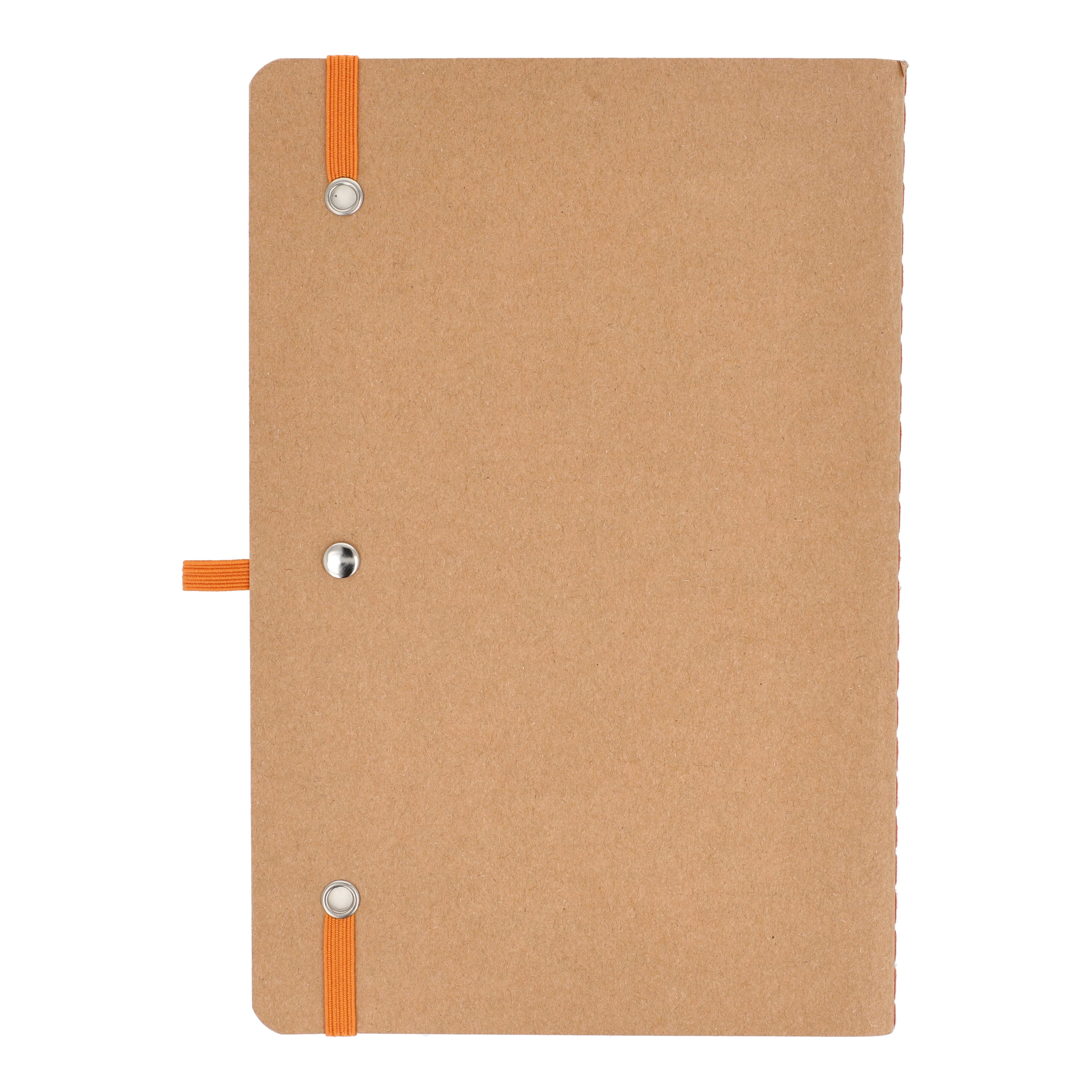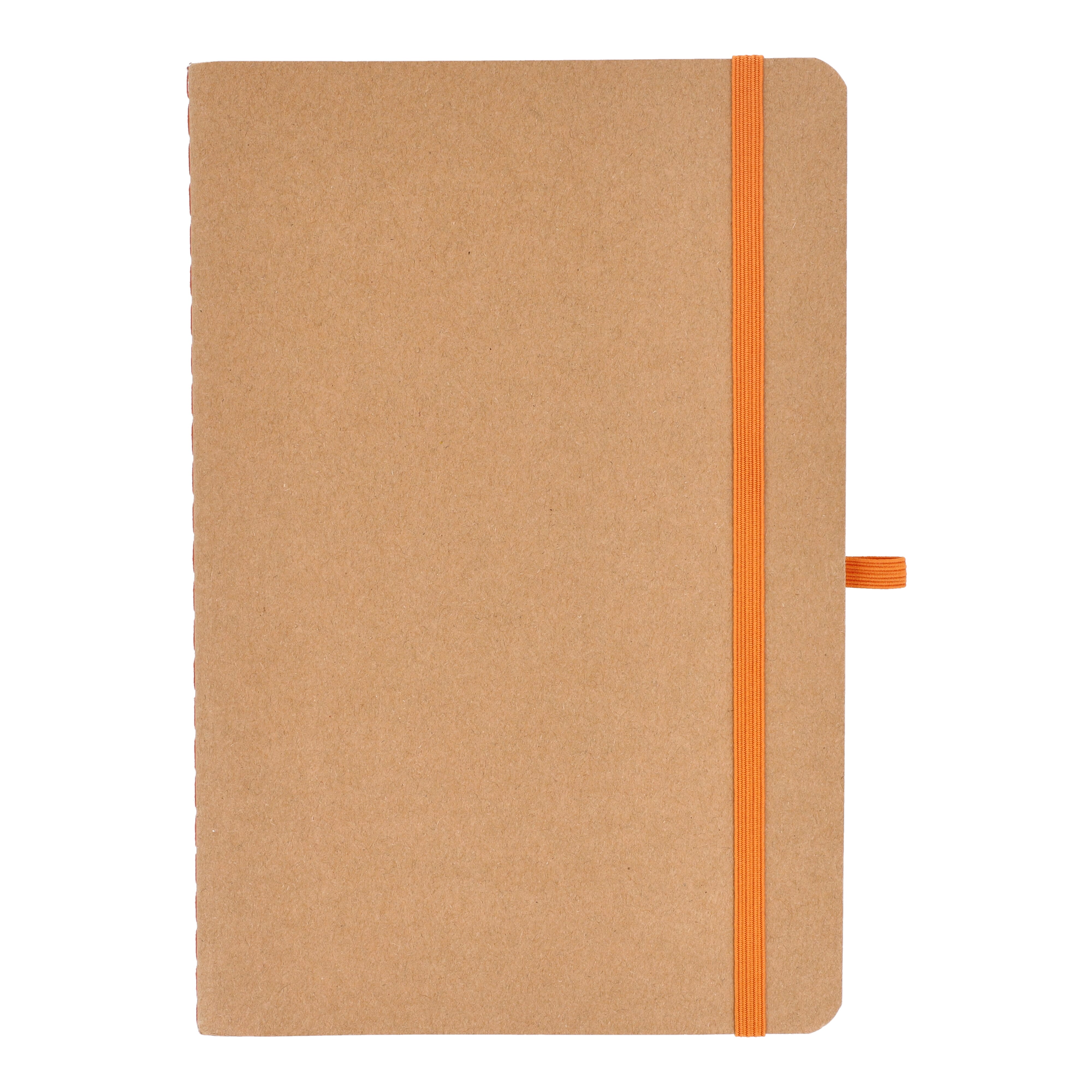 A5-Notizbuch mit weichem Kraftpapiereinband, abgerundeten Ecken, farbigem Gummiverschluss und Stiftschlaufe. Es hat 60 linierte cremefarbene Blätter aus FSC-zertifiziertem Papier. Eine praktische und natürlich wirkende Option für tägliche Notizen.