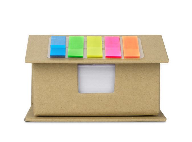 Ein umweltfreundlicher Behälter in Form eines Hauses. Zusätzlich kleine Haftnotizen in verschiedenen Farben.