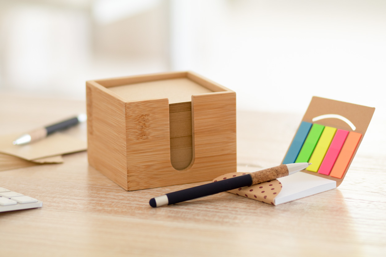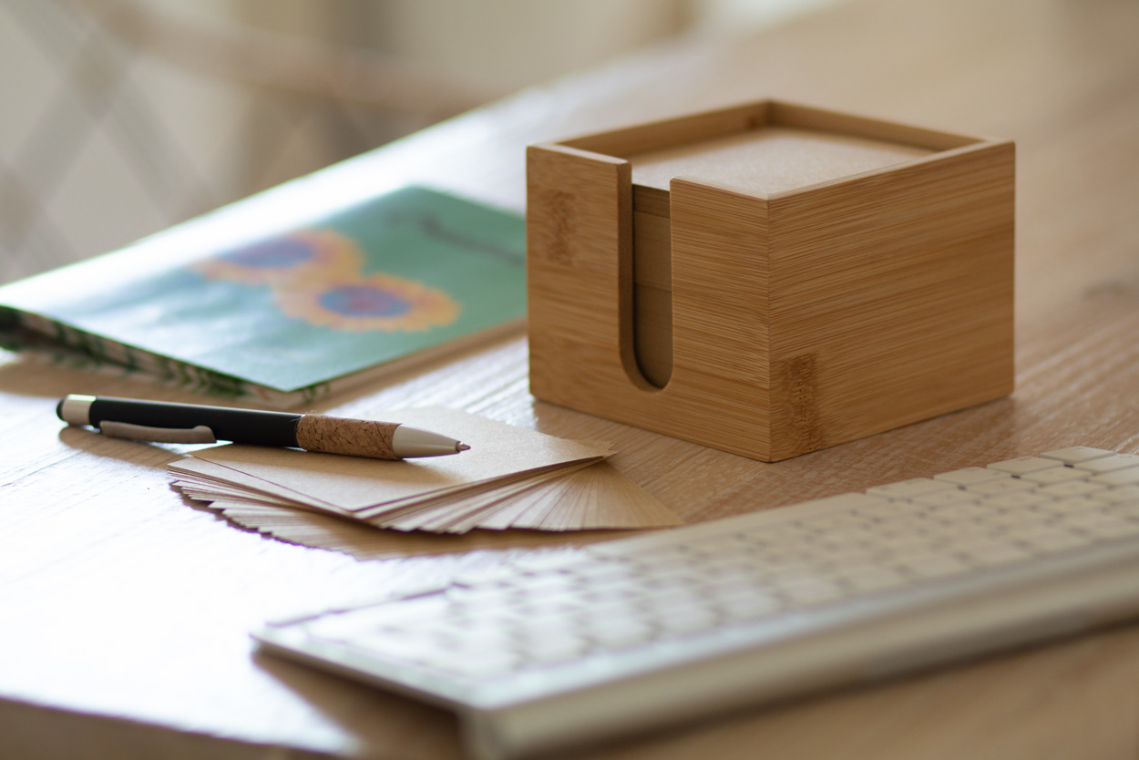 Notizzettelspender aus Bambus mit Notizzettelblock (600 Blatt) aus Recycling-Papier (80 g / m²).