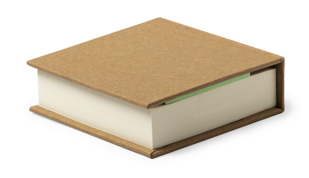 Notizhalter mit festen Einbänden aus widerstandsfähigem recyceltem Karton. Enthält 200 glatte Blätter und 125 Mini-Haftnotizen.