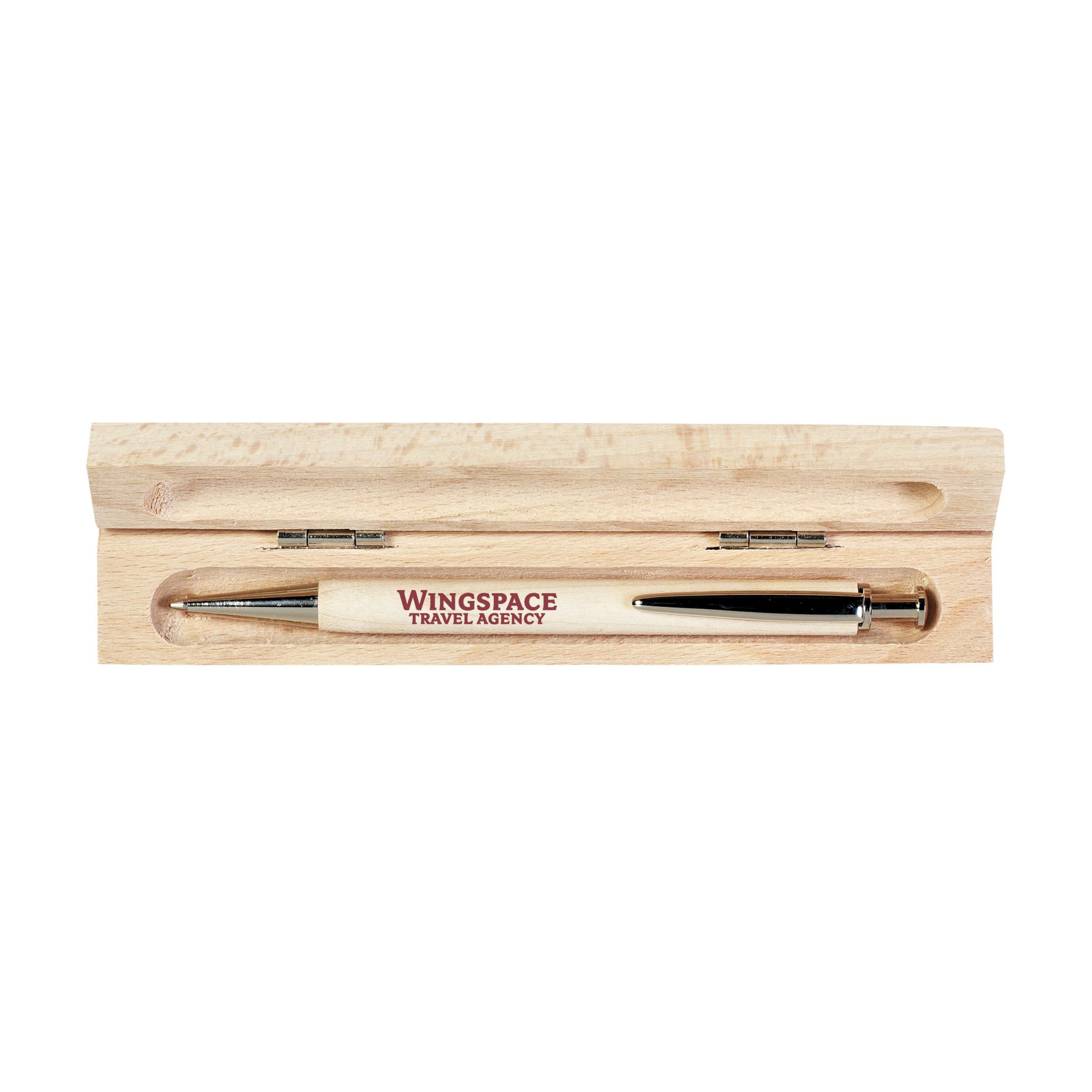 Blauschreibender Kugelschreiber aus massivem Birkenholz mit verchromtem Clip, Druckknopf und Spitze. In einer Kassette aus Birkenholz.