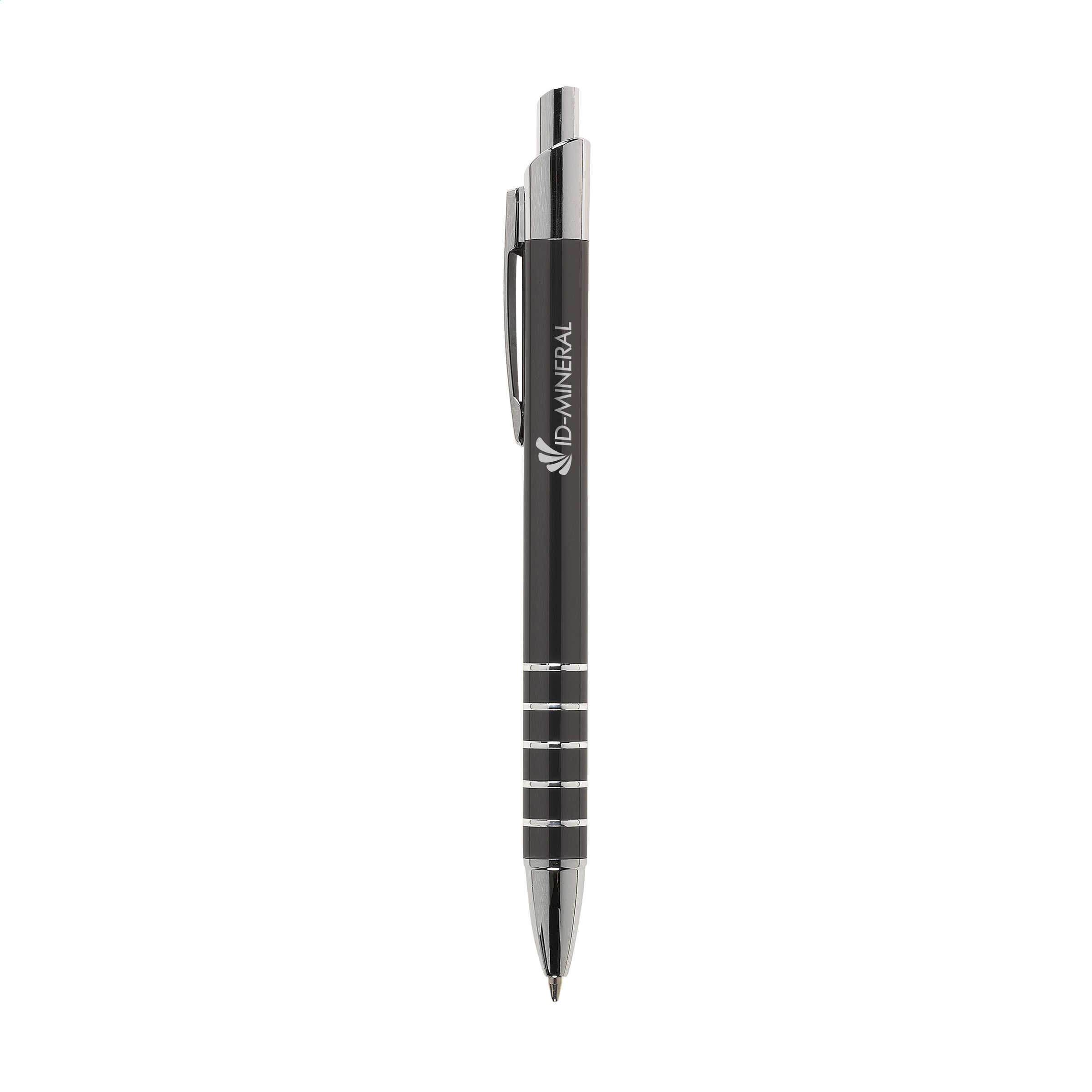 Beschreibung: Blauschreibender Aluminiumkugelschreiber in Metallic-Look, mit Metallclip und Zwischenringen.