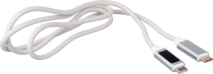 Nylon-Ladekabel mit Aluminium-Buchsen. Länge: 1 Meter. USB-C auf USB-C. Kapazität: 100 W. Blaue Anzeige der Ladegeschwindigkeit an einer Buchse. Einzeln verpackt in einer braunen Kartonschachtel. Datenübertragungsrate 480Mbps.