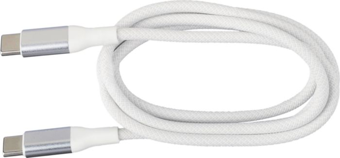 Nylon Typ-C auf Typ-C Daten- und Ladekabel mit einer Länge von 1 Meter. Datenübertragungsgeschwindigkeit von 120 Mbps. Die Aluminiumbuchse ist vergrößert, um eine größere Druckposition zu ermöglichen. 35W Ladeleistung. Einzeln verpackt in einem braunen Geschenkkarton.