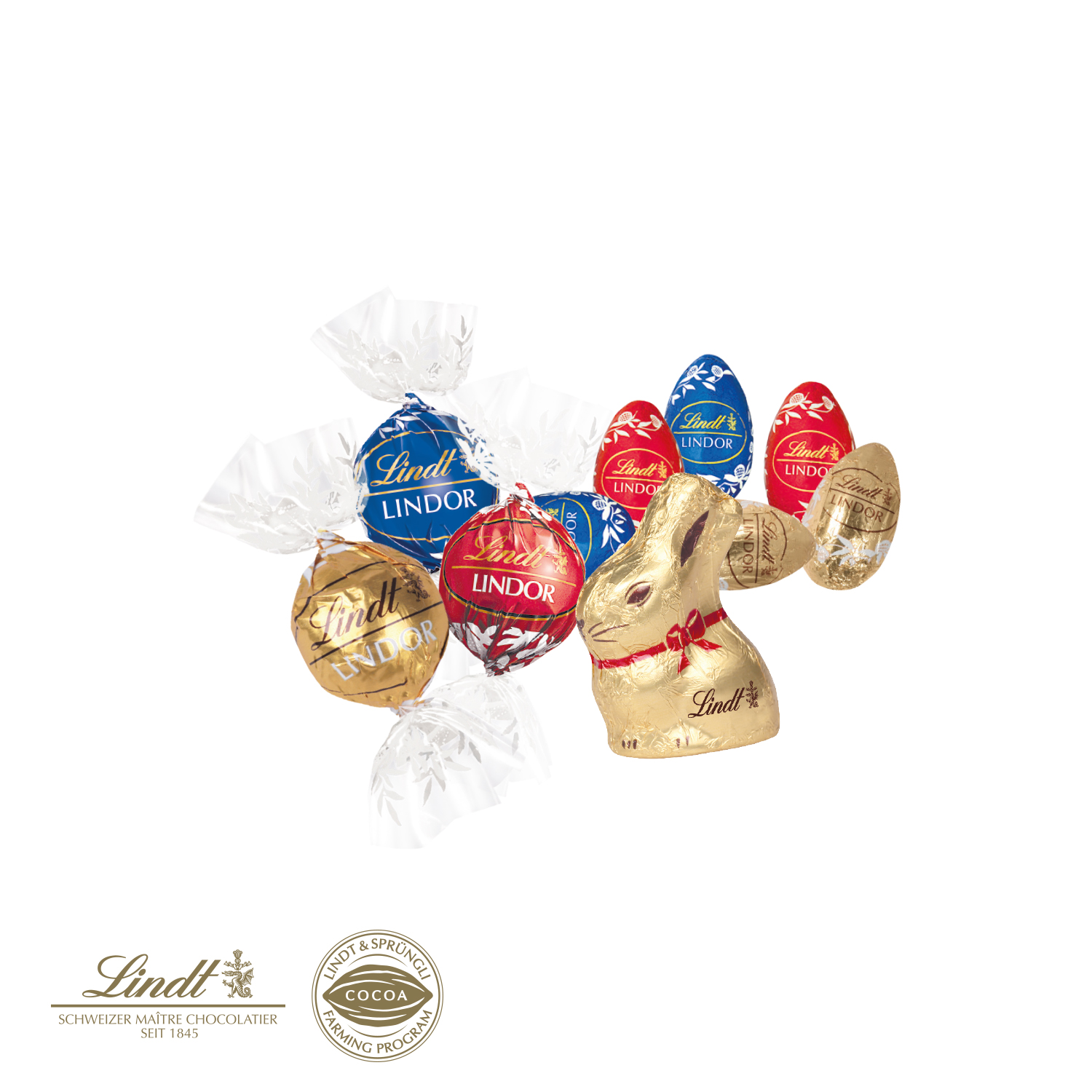 Schokoladenmischung von Lindt (ca. 110 g) 4 Lindor Pralinés mit einer zartschmelzenden Füllung, 10 Lindt Lindor Schokoladen-Eiern bunt gemischt und 1 Lindt Goldhase.