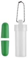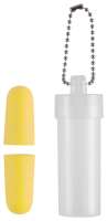Farbige Ohrstöpsel in transparentem Kunststoffetui mit Metallkette.
