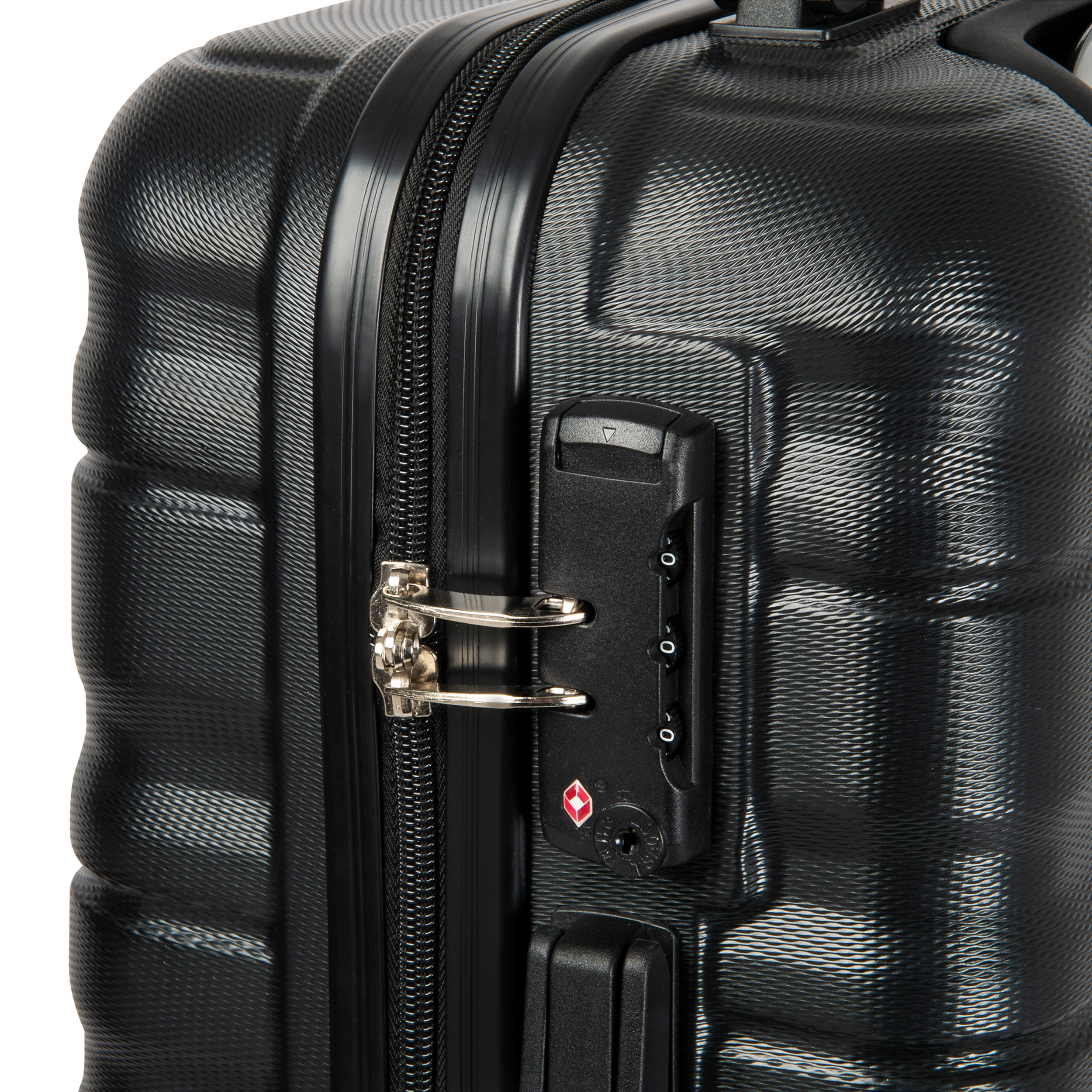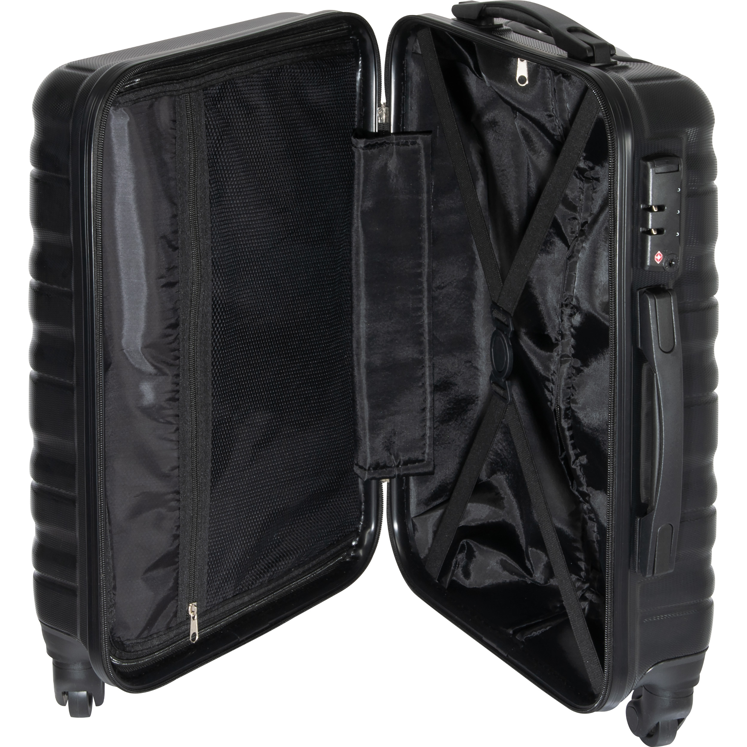 Robuster Hartschalen Reisetrolley mit vielen Innenfächern und TSA Schloss. Ihre Werbung lasern wir auf ein Metallplättchen und bringen es am Griff an.
