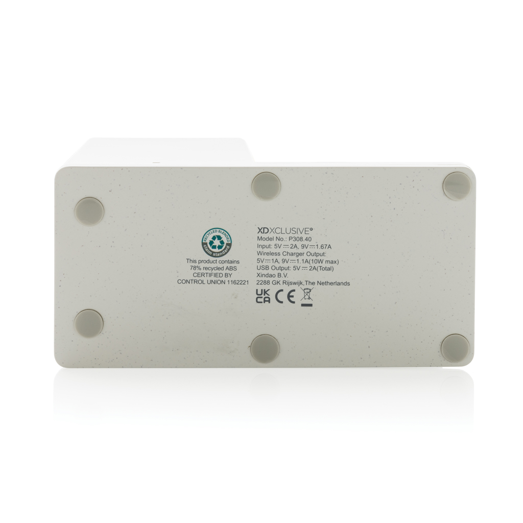 Kabelloses 10W-Schnellladegerät mit Stiftehalter aus RCS (Recycled Claim Standard)-zertifiziert recyceltem ABS. Gesamter Recyclinganteil: 78% basierend auf dem Gesamtgewicht des Artikels. Die RCS-Zertifizierung gewährleistet eine vollständig zertifizierte Lieferkette der recycelten Materialien. Der kabellose Ladebereich besteht aus FSC 100 Bambus. Mit zwei USB-Anschlüssen auf der Rückseite zum Aufladen per Kabel. Kabelloses Laden ist kompatibel mit Android der neuesten Generation, iPhone 8 und höher. Artikel und Zubehör PVC-frei. Inklusive 120cm Type-C Ladekabel aus RCS-zertifiziertem Recycling-TPE. Verpackt in FSC-Mix-Kraftkarton. Type-C Input: 5V/2A; 9V/2A; Wireless Output: 5V/1A;9V/1,1A; (10 W).