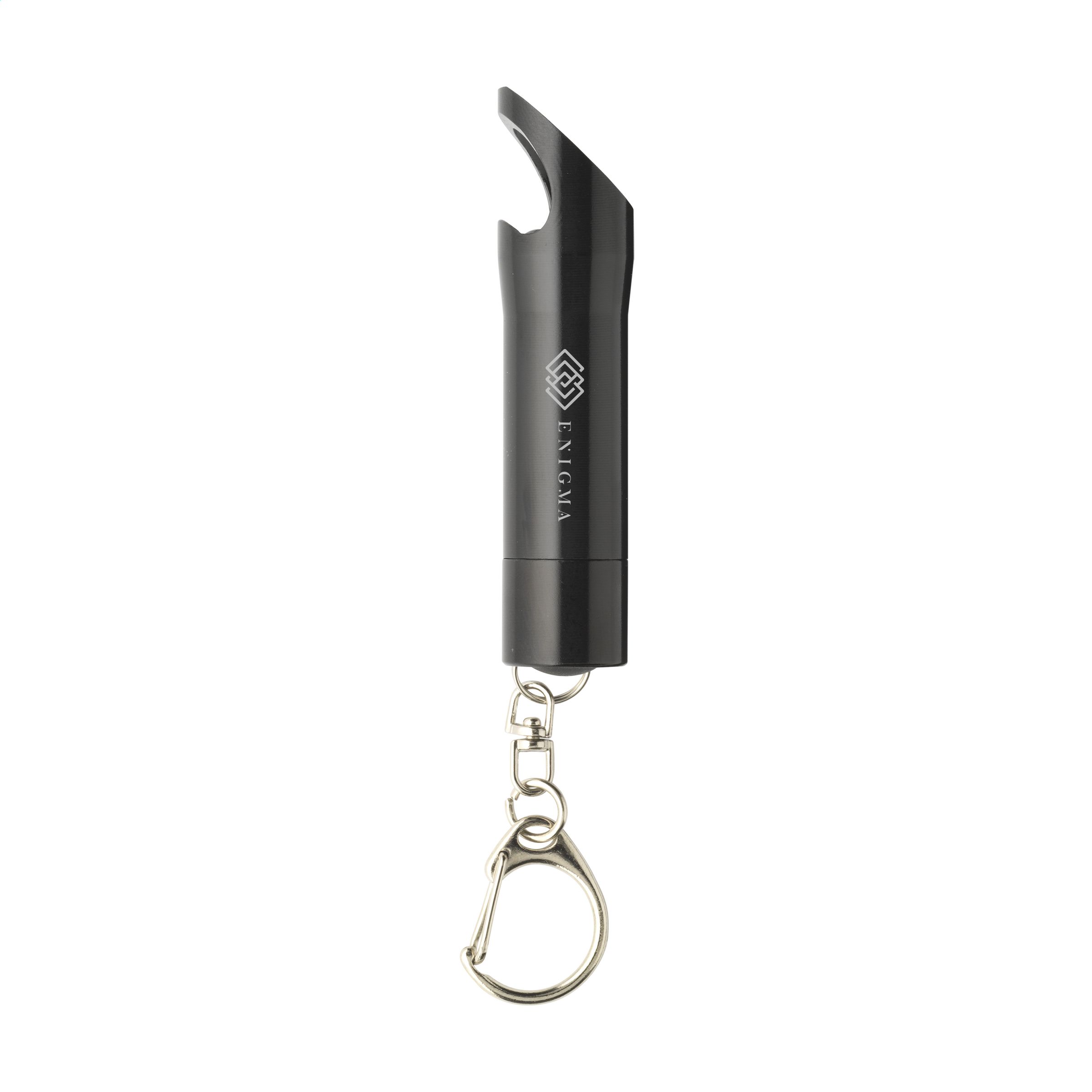 Stablampe aus Aluminium mit 3 hellweißen, energiesparenden LED-Lampen und Flaschenöffner. An einem Karabinerhaken. Inkl. Zellbatterien. Wird einzeln in einem Kraftkarton geliefert.
