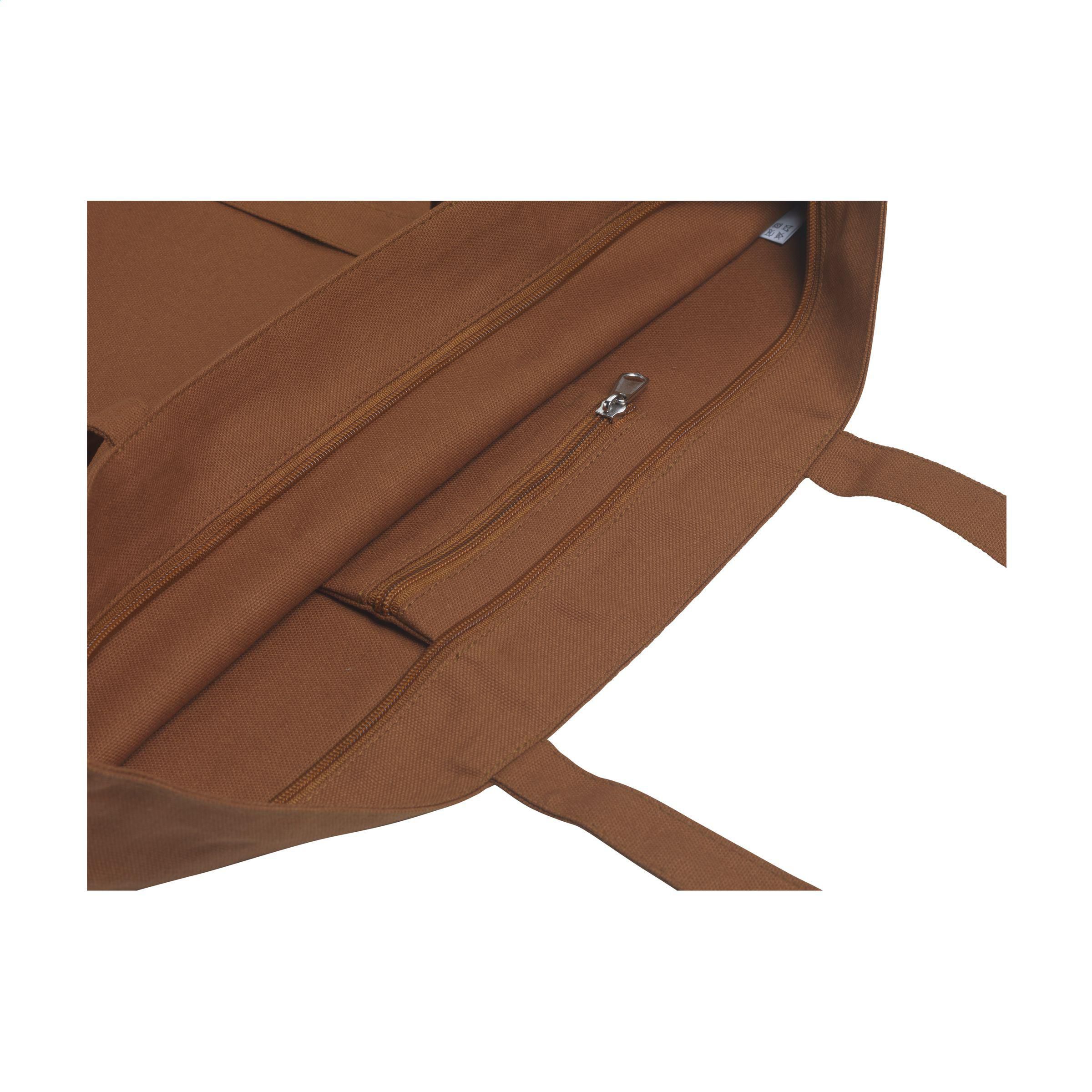 Recycelte Einkaufstasche mit langen Henkeln aus 100% fest gewebtem, extra schwerem Bio-Canvas (320 g/m²). Mit langen Griffe und Reißverschluss. Die großzügige, robuste Tasche bietet viel Platz. Fassungsvermögen ca. 28 Liter.