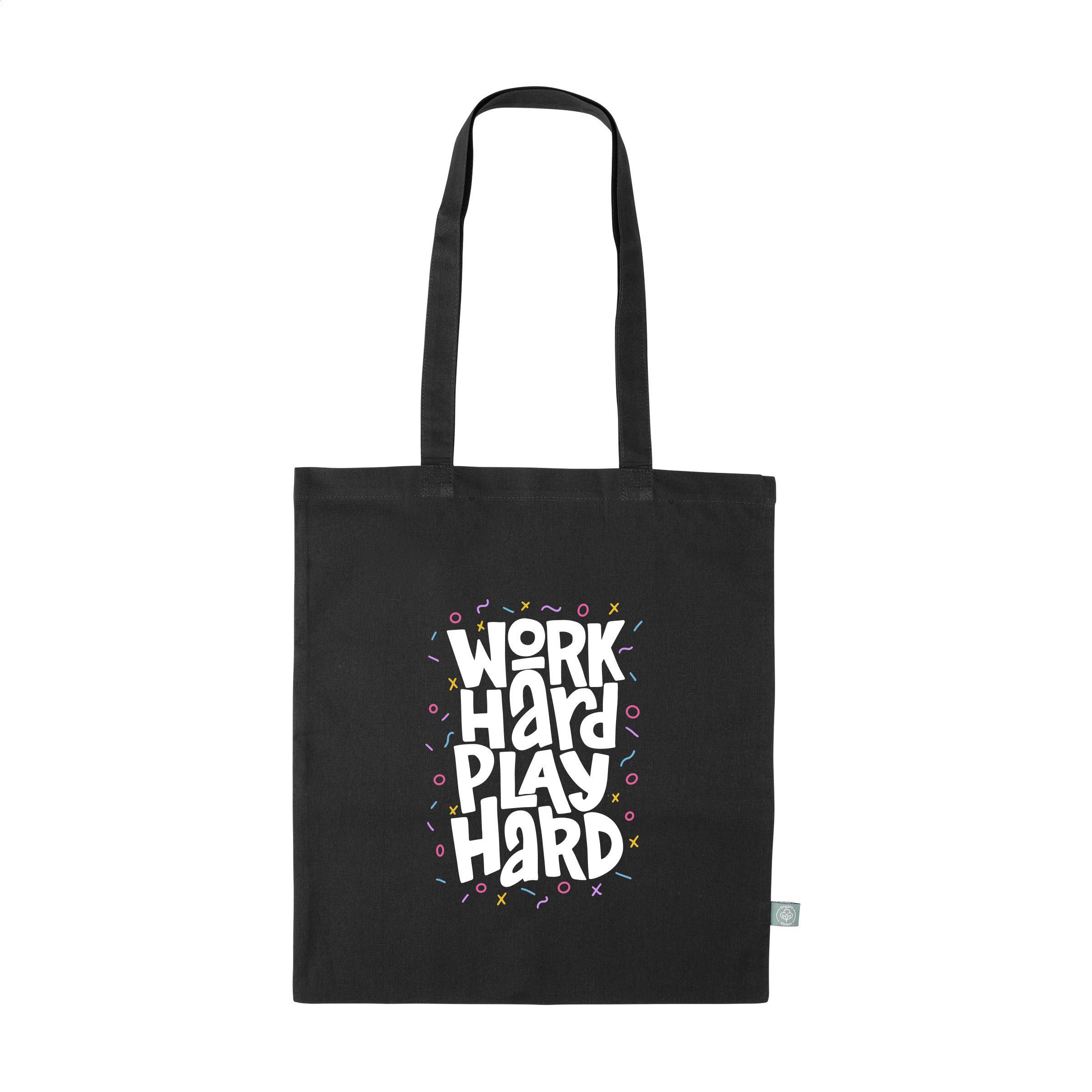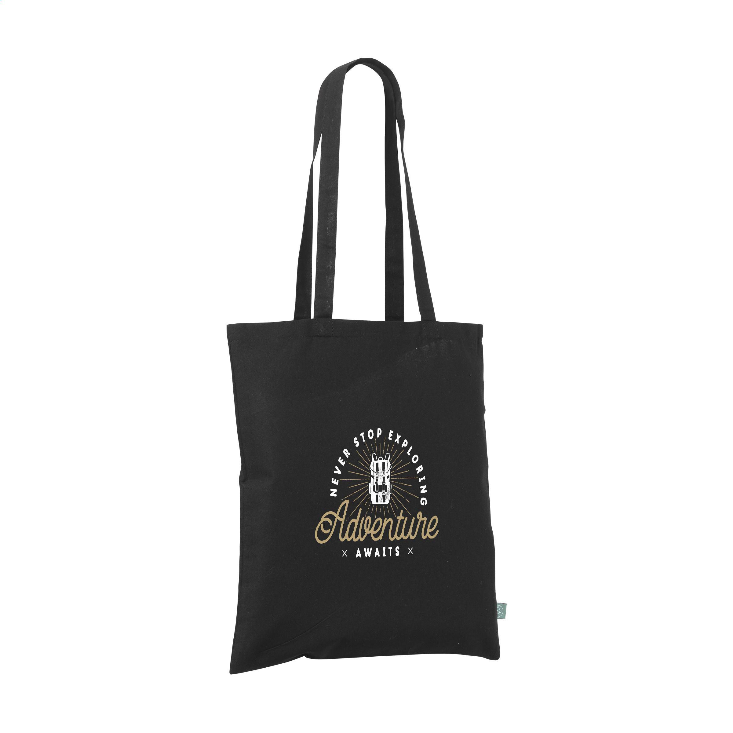 Robuste Einkaufstasche hergestellt aus 100% ökologischer Qualitätsbaumwolle (140 g/m²). Mit langen Henkeln. Fassungsvermögen ca. 8 Liter.