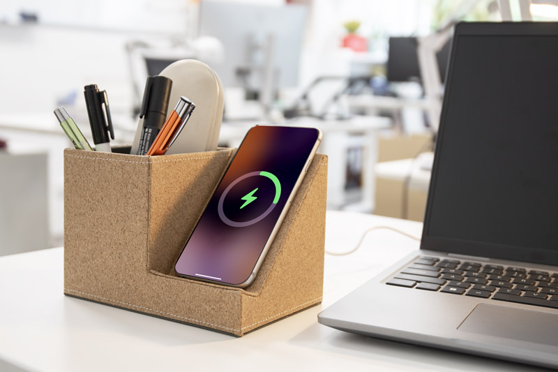 COVBI ist ein funktioneller Schreibtisch-Organizer aus Naturkork. Das Gadget kombiniert einen Werkzeugkasten für Schreibutensilien mit einem kabellosen 15-W-Ladegerät, ideal zum schnellen Aufladen Ihres Smartphones. Darüber hinaus ist ein USB-C-Kabel für eine schnelle und sichere Stromverbindung enthalten. COVBI bringt Ordnung und moderne Technologie in Ihren Arbeitsbereich.