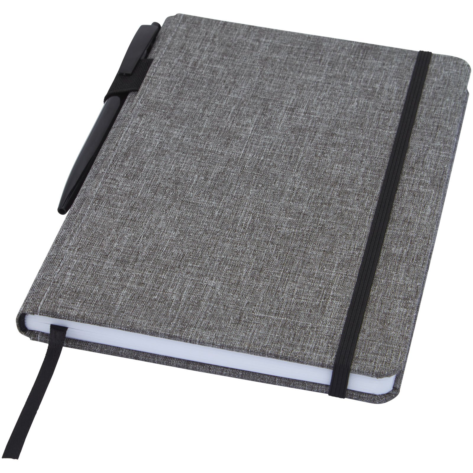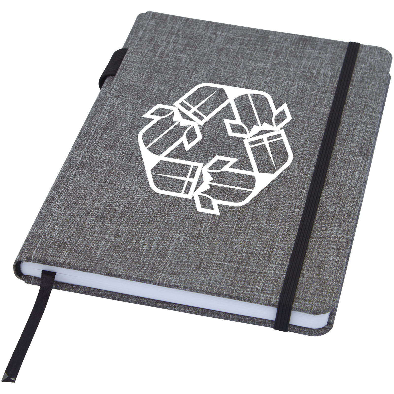 A5 Notizbuch mit einem Cover aus RPET-Stoff. Mit 96 Blatt, 70 g / m² recyceltes Papier mit liniertem Layout, Stiftschlaufe und Leseband. Verpackt in einer Kartonhülle.