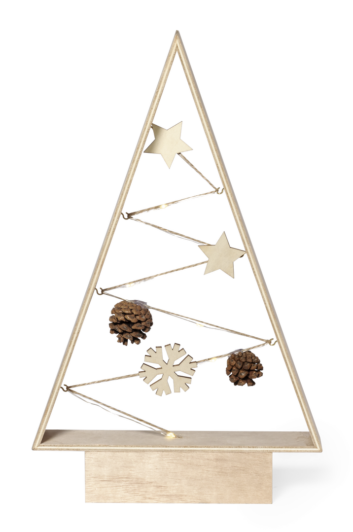 Moderner und eleganter Weihnachtsbaum aus Naturholz. Eine originelle dekorative Ergänzung mit Ornamenten aus natürlichen Materialien, die alle durch ein Geflecht aus Leds beleuchtet werden, ideal um eine gemütliche Atmosphäre zu schaffen. Mit einer einfachen Anleitung in Englisch und Spanisch. Hergestellt aus pflanzlichen Elementen, um die Verwendung von natürlichen Rohstoffen zu fördern und die Schadstoffemissionen zu reduzieren.