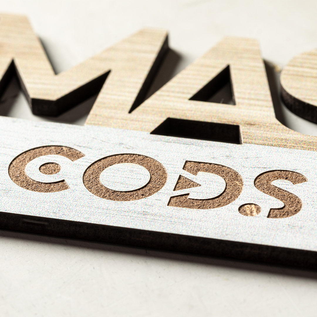 Weihnachtsschmuck mit Weihnachtsbaummotiv, aus Naturholz, mit gestanztem XMAS-Text und origineller Bicolor-Beschichtung. Große Brandingfläche, einfache Montage und unverwechselbares Made in Europe.